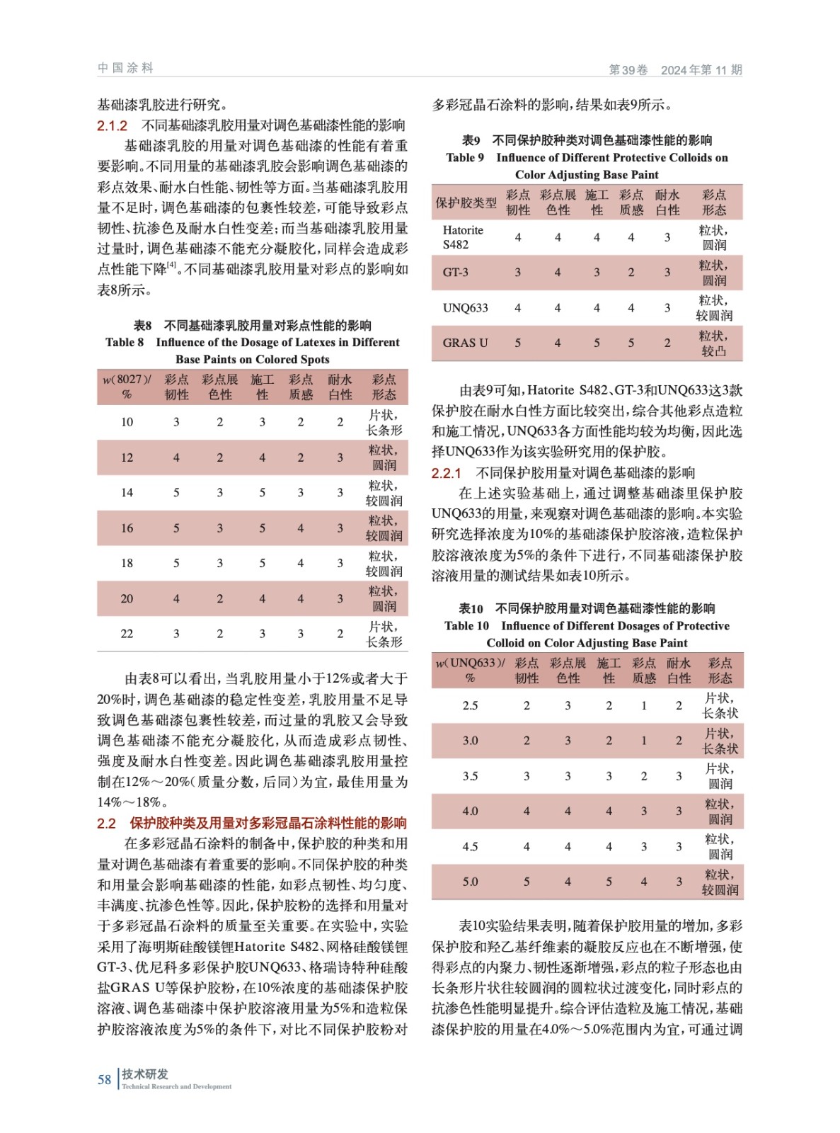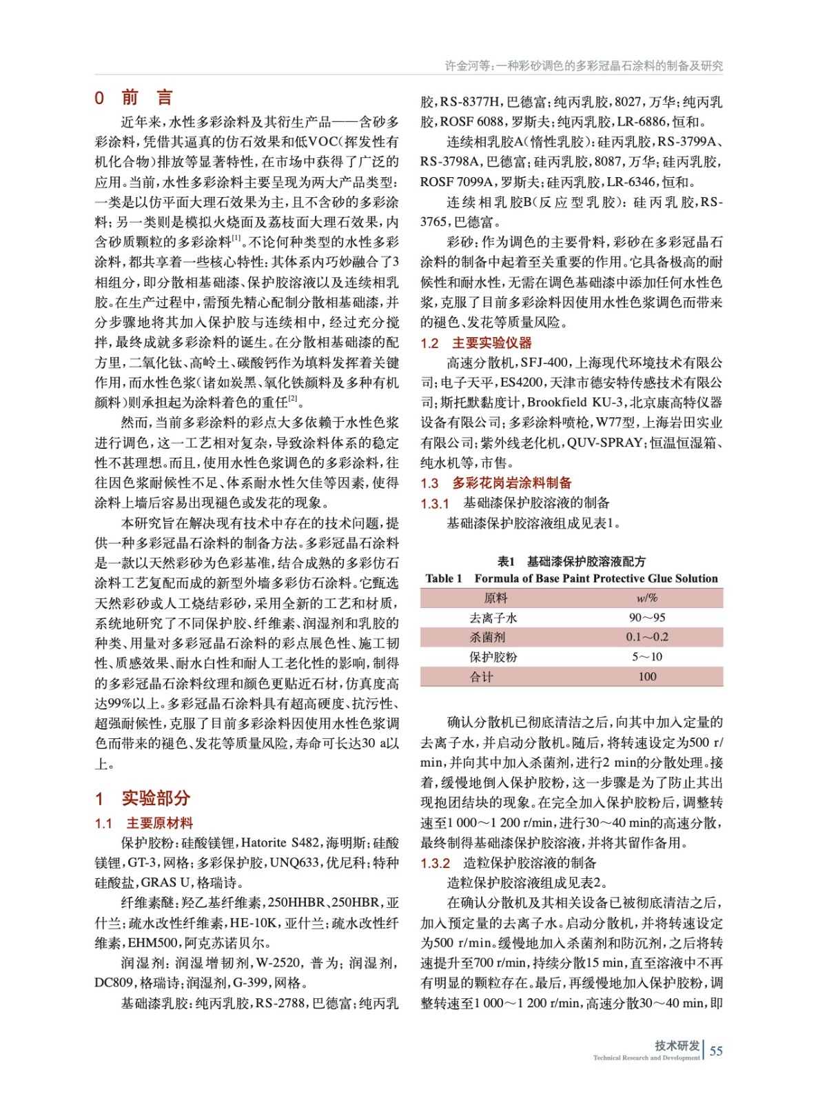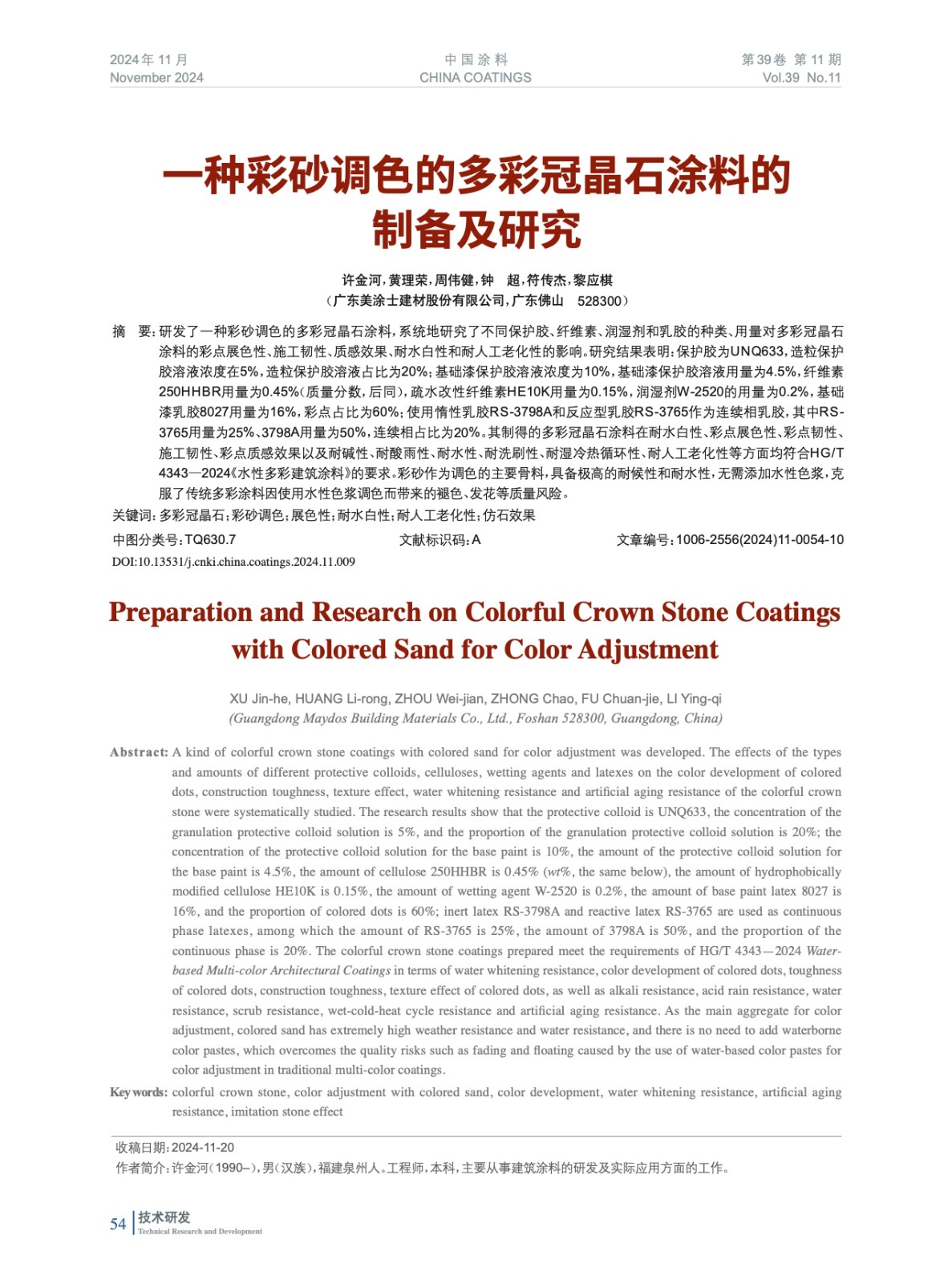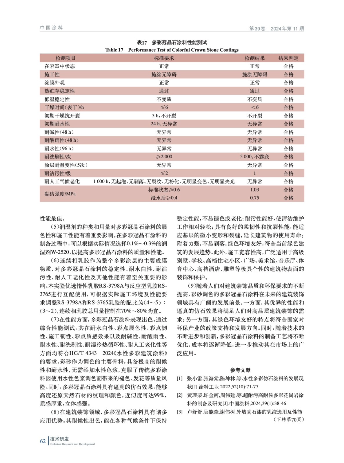 摘要:研發了一種彩砂調色的多彩冠晶石涂料,系統地研究了不同保護膠、纖維素、潤濕劑和乳膠的種類、用量對多彩冠晶石涂料的彩點展色性、施工韌性、質感效果、耐水白性和耐人工老化性的影響。研究結果表明:保護膠為UNQ633,造粒保護膠溶液濃度在5%,造粒保護膠溶液占比為20%;基礎漆保護膠溶液濃度為10%,基礎漆保護膠溶液用量為4.5%,纖維素250HHBR用量為0.45%(質量分數,后同),疏水改性纖維素HE10K用量為0.15%,潤濕劑W-2520的用量為0.2%,基礎漆乳膠8027用量為16%,彩點占比為60%;使用惰性乳膠RS-3798A和反應型乳膠RS-3765作為連續相乳膠,其中RS-3765用量為25%、3798A用量為50%,連續相占比為20%。其制得的多彩冠晶石涂料在耐水白性、彩點展色性、彩點韌性、施工韌性、彩點質感效果以及耐堿性、耐酸雨性、耐水性、耐洗刷性、耐濕冷熱循環性、耐人工老化性等方面均符合HG/T 4343—2024《水性多彩建筑涂料》的要求。彩砂作為調色的主要骨料,具備極高的耐候性和耐水性,無需添加水性色漿,克服了傳統多彩涂料因使用水性色漿調色而帶來的褪色、發花等質量風險。
