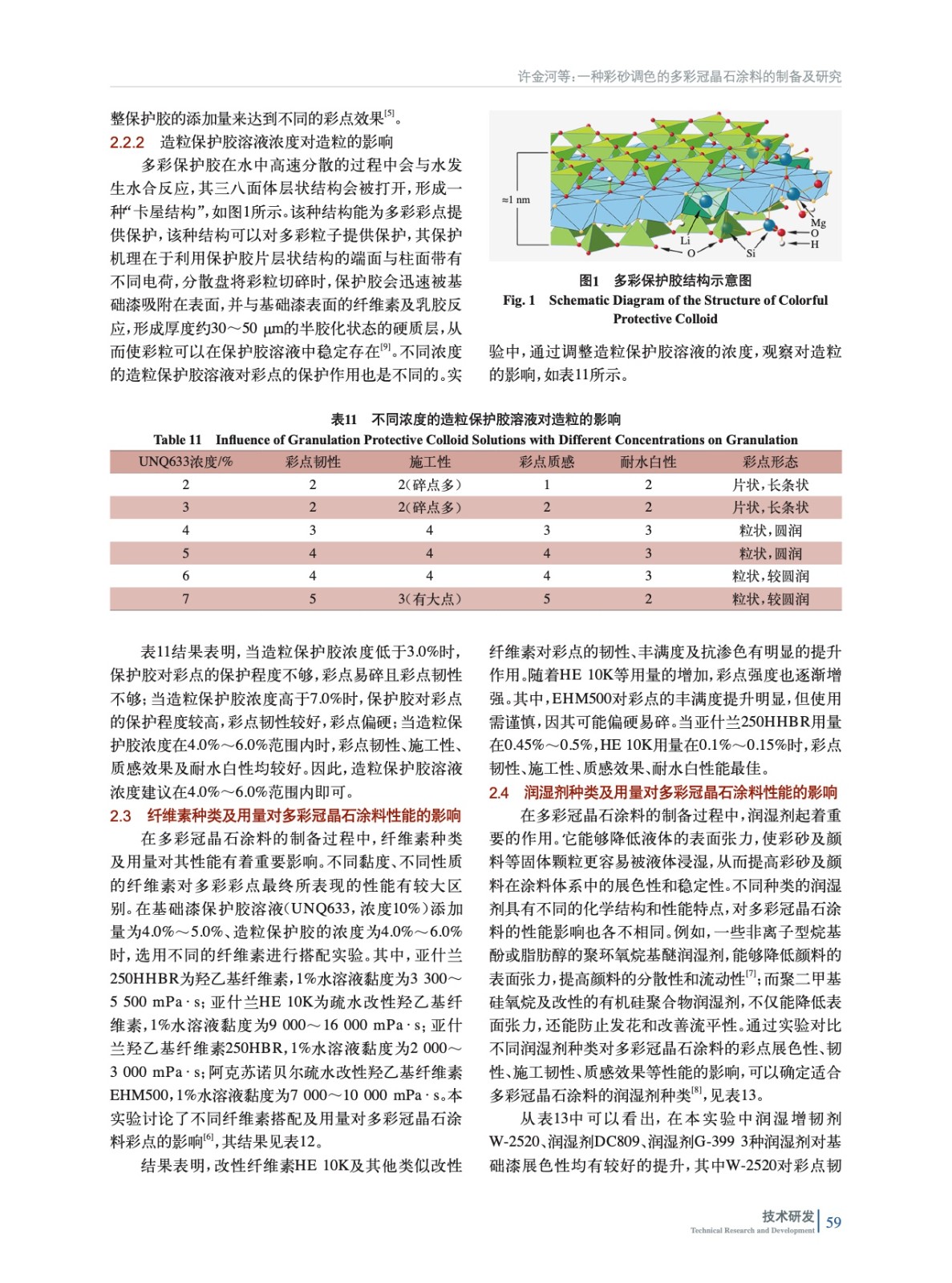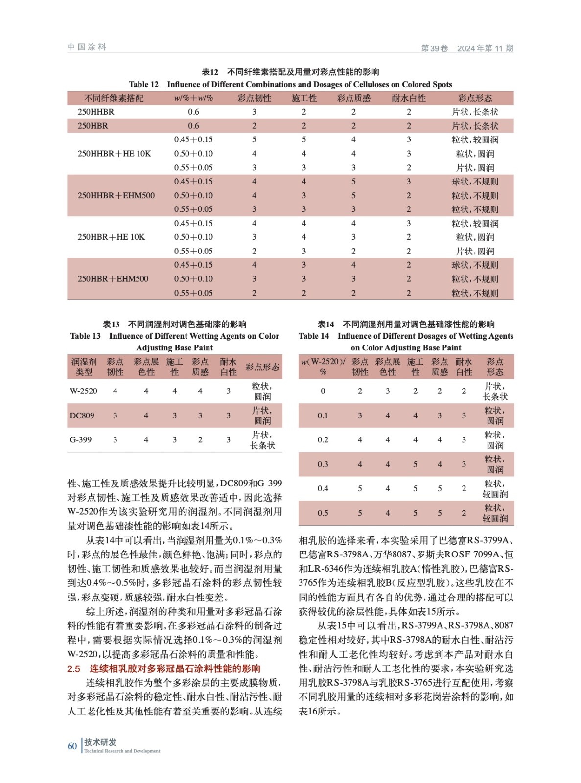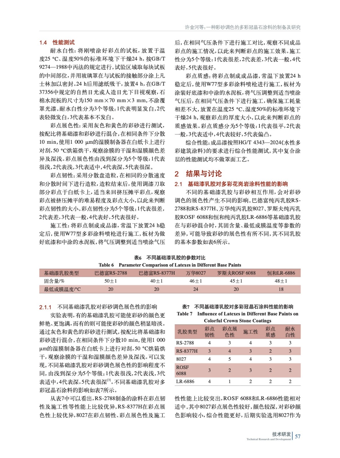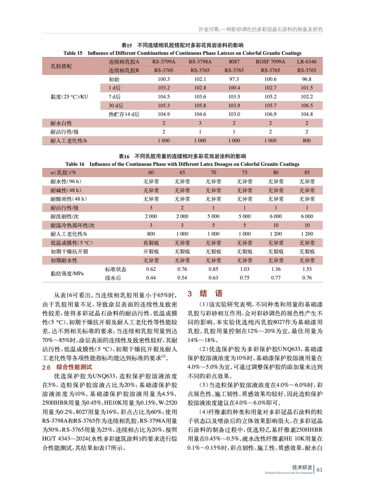 摘要:研發了一種彩砂調色的多彩冠晶石涂料,系統地研究了不同保護膠、纖維素、潤濕劑和乳膠的種類、用量對多彩冠晶石涂料的彩點展色性、施工韌性、質感效果、耐水白性和耐人工老化性的影響。研究結果表明:保護膠為UNQ633,造粒保護膠溶液濃度在5%,造粒保護膠溶液占比為20%;基礎漆保護膠溶液濃度為10%,基礎漆保護膠溶液用量為4.5%,纖維素250HHBR用量為0.45%(質量分數,后同),疏水改性纖維素HE10K用量為0.15%,潤濕劑W-2520的用量為0.2%,基礎漆乳膠8027用量為16%,彩點占比為60%;使用惰性乳膠RS-3798A和反應型乳膠RS-3765作為連續相乳膠,其中RS-3765用量為25%、3798A用量為50%,連續相占比為20%。其制得的多彩冠晶石涂料在耐水白性、彩點展色性、彩點韌性、施工韌性、彩點質感效果以及耐堿性、耐酸雨性、耐水性、耐洗刷性、耐濕冷熱循環性、耐人工老化性等方面均符合HG/T 4343—2024《水性多彩建筑涂料》的要求。彩砂作為調色的主要骨料,具備極高的耐候性和耐水性,無需添加水性色漿,克服了傳統多彩涂料因使用水性色漿調色而帶來的褪色、發花等質量風險。