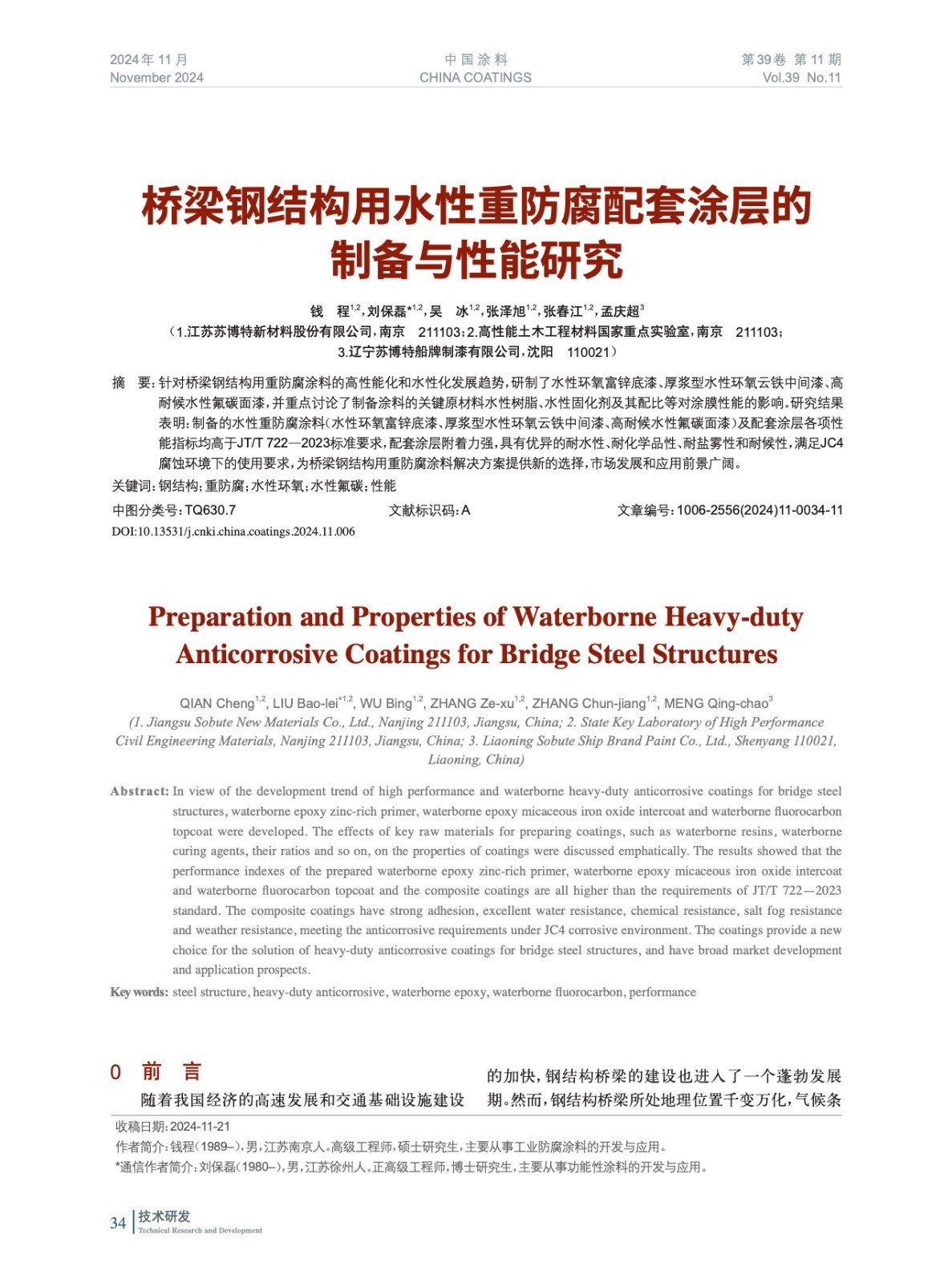 本文系作者@錢 程,劉保磊,吳 冰,張澤旭,張春江,孟慶超 授權中國涂料網發表,并經中國涂料網編輯,未經允許不得轉載,如需轉載請聯系chinacoatingnet@vip.163.com