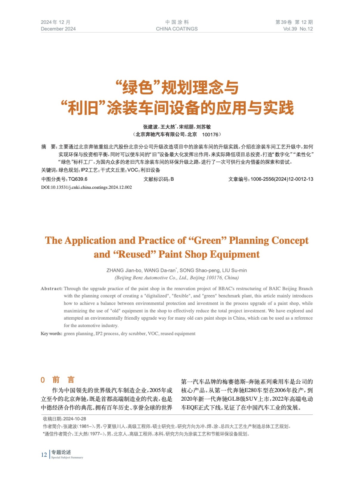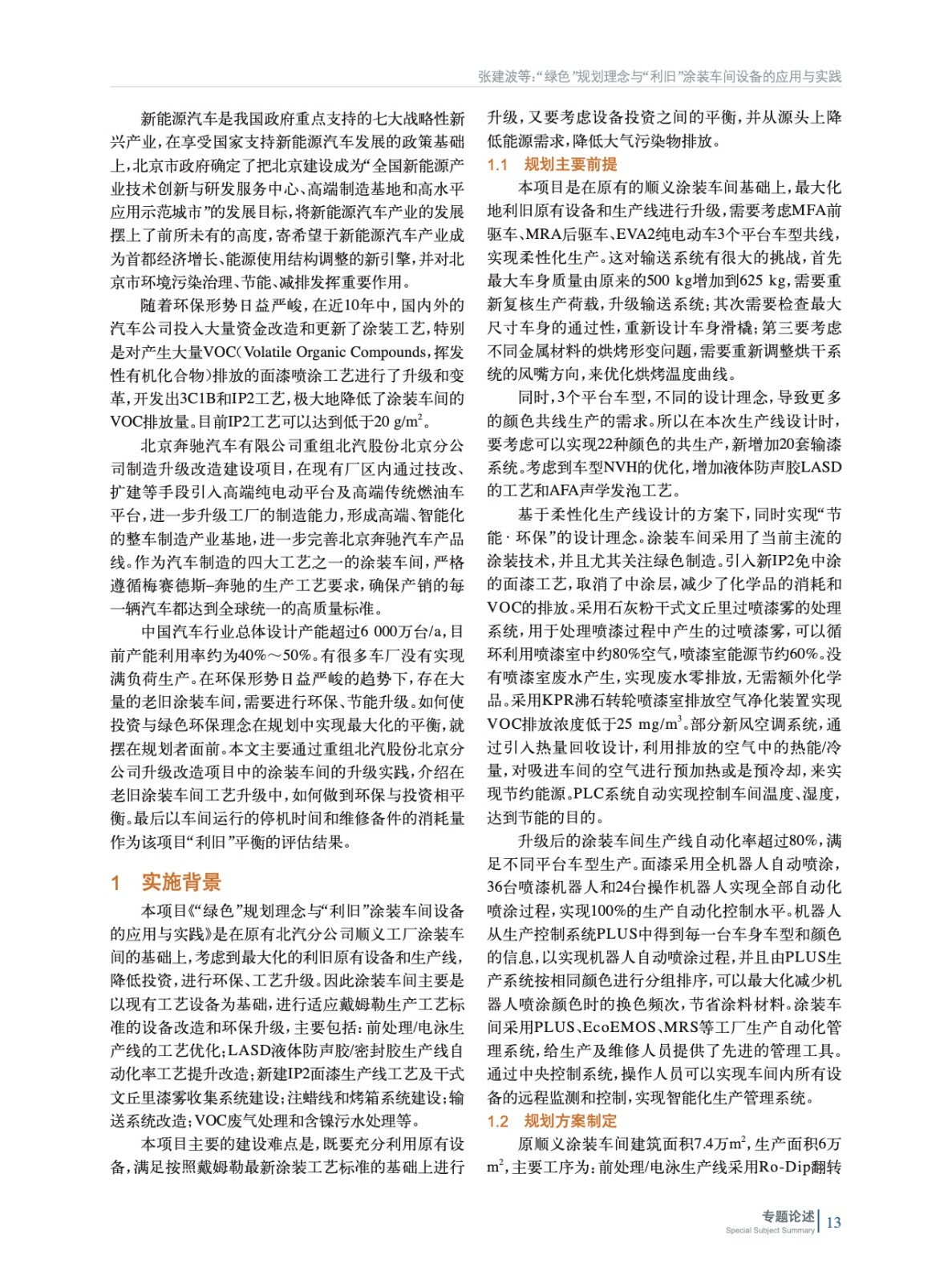 摘要:主要通過北京奔馳重組北汽股份北京分公司升級(jí)改造項(xiàng)目中的涂裝車間的升級(jí)實(shí)踐,介紹在涂裝車間工藝升級(jí)中,如何實(shí)現(xiàn)環(huán)保與投資相平衡,同時(shí)可以使車間的“舊”設(shè)備最大化發(fā)揮出作用,來實(shí)際降低項(xiàng)目總投資,打造“數(shù)字化”“柔性化”“綠色”標(biāo)桿工廠。為國(guó)內(nèi)眾多的老舊汽車涂裝車間的環(huán)保升級(jí)之路,進(jìn)行了一次可供行業(yè)內(nèi)借鑒的探索和嘗試。