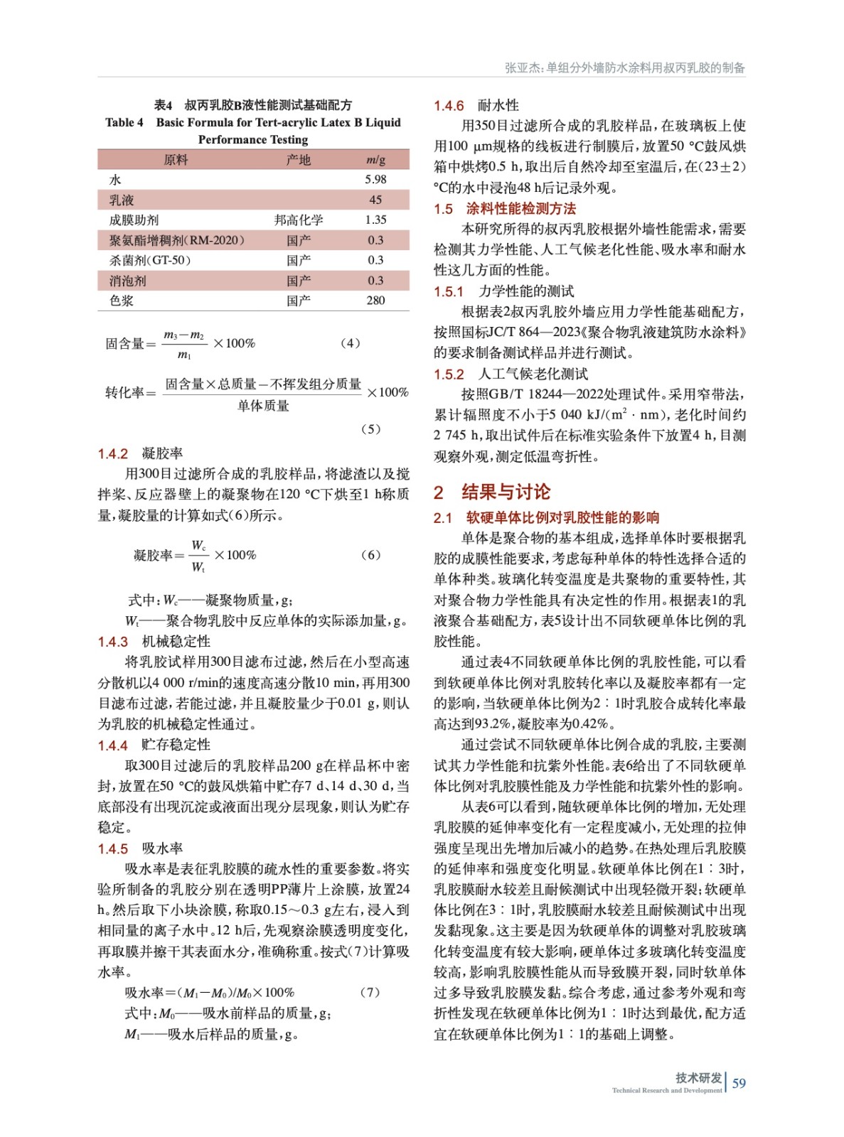 通過調整軟硬單體比例、乳化劑種類、叔碳酸乙烯酯的含量、引發劑的用量測試了乳膠力學、耐候和耐水等性能,制備出適用于建筑外墻的叔丙乳膠,對單組分叔丙乳膠制備具有一定的指導意義。