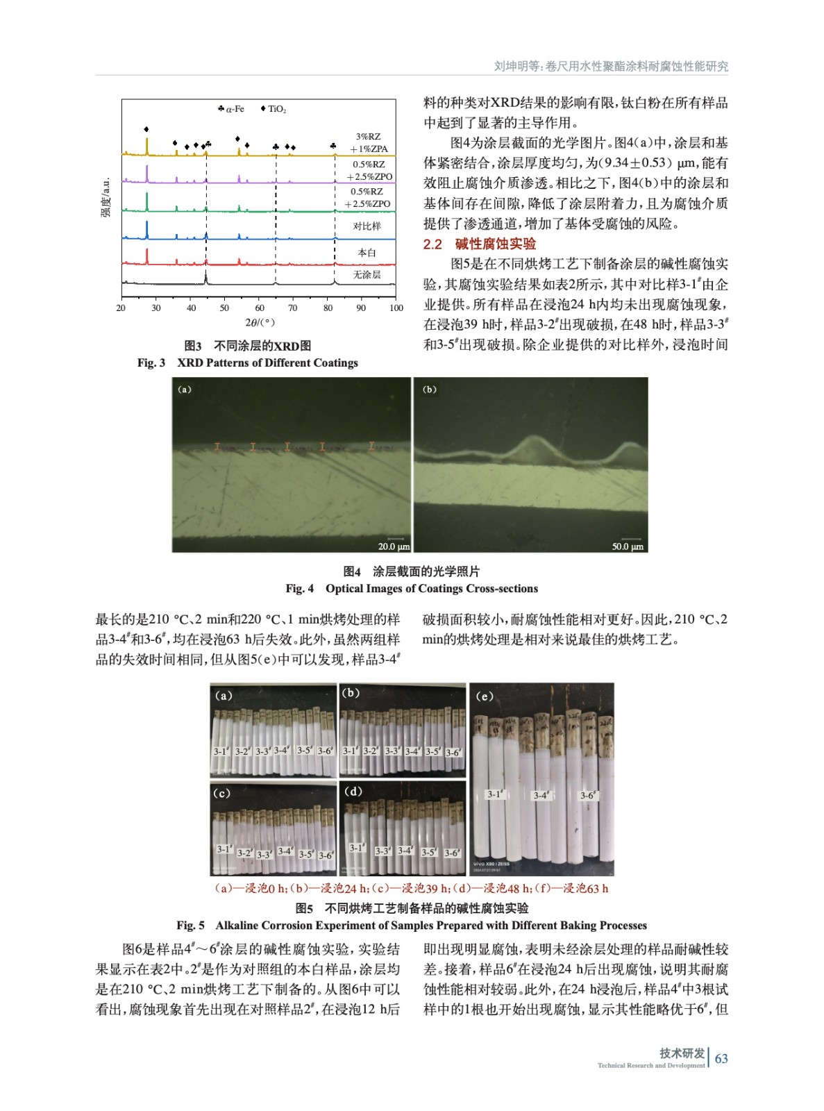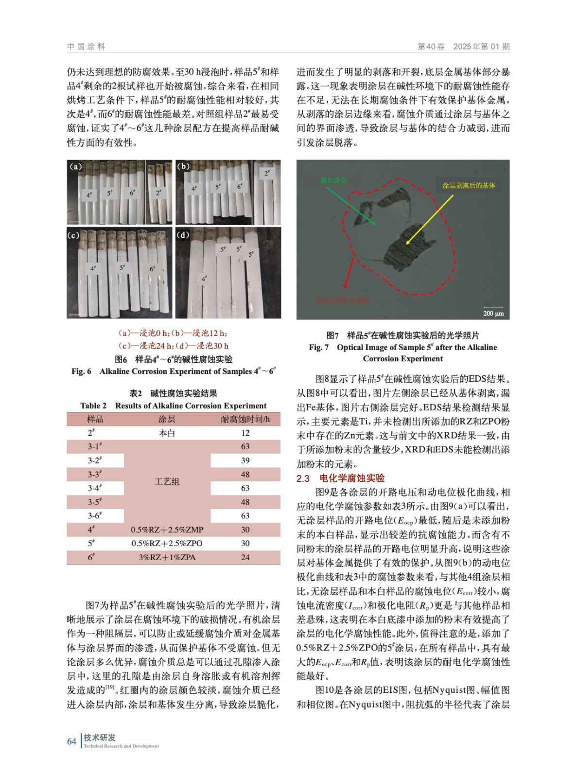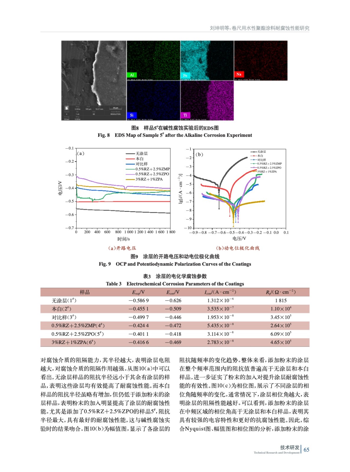 摘要:以水性聚酯涂料為底漆,研究了不同烘烤工藝對涂層耐堿性腐蝕的影響。在確定最佳烘烤工藝(210 ℃、2 min)后,實驗加入了多磷酸鉬鋅水合物(ZPA)、改性正磷酸鹽(ZMP)、有機改性磷酸鋅鋁鉬水合物(ZPO)、有機緩蝕劑(RZ)4種納米粉末,結合電化學測試和堿性腐蝕實驗,評估其對涂層耐腐蝕性能的影響。實驗結果表明,加入納米粉末后,涂層的耐腐蝕性能顯著提升,尤其是添加0.5%(質量分數,后同)RZ+2.5%ZPO的涂層表現出最佳的電化學耐腐蝕性能。該研究為開發高性能卷尺用聚酯涂層提供了有效的理論依據與實驗支持。