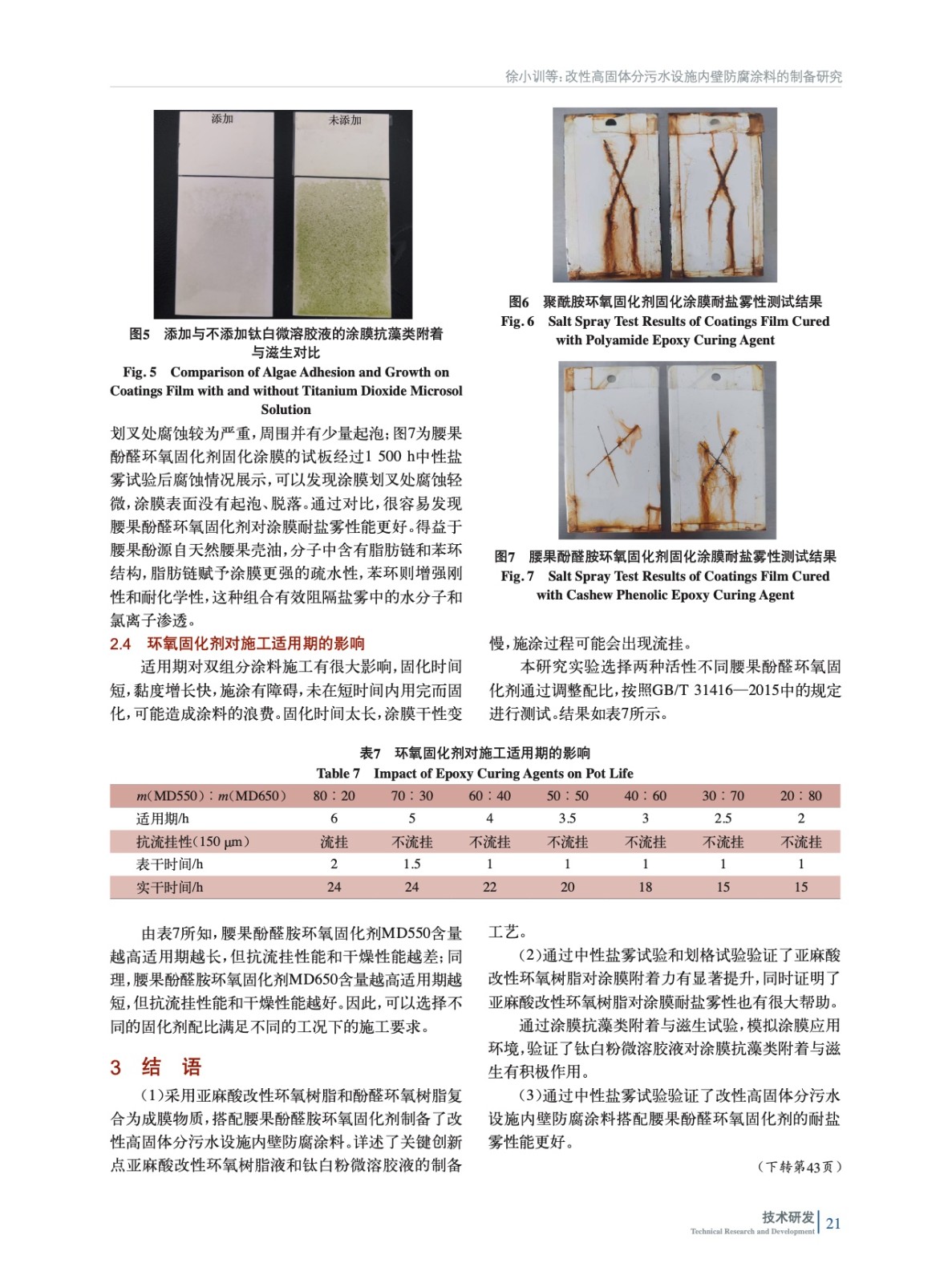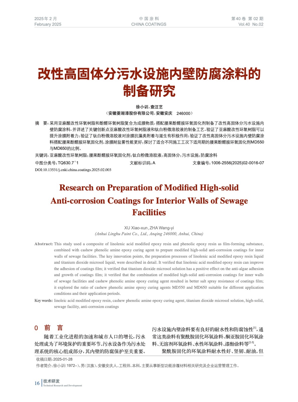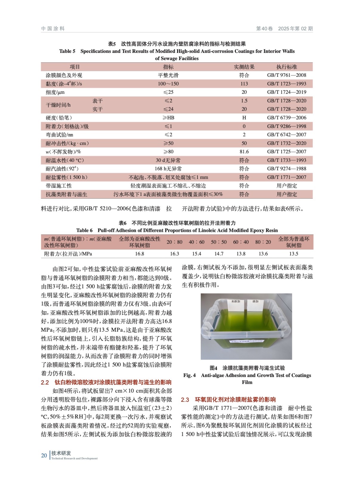 摘要:采用亞麻酸改性環(huán)氧樹(shù)脂和酚醛環(huán)氧樹(shù)脂復(fù)合為成膜物質(zhì),搭配腰果酚醛胺環(huán)氧固化劑制備了改性高固體分污水設(shè)施內(nèi)壁防腐涂料,并詳述了關(guān)鍵創(chuàng)新點(diǎn)亞麻酸改性環(huán)氧樹(shù)脂液和鈦白粉微溶膠液的制備工藝。驗(yàn)證了亞麻酸改性環(huán)氧樹(shù)脂可以提升涂膜附著力;驗(yàn)證了鈦白粉微溶膠液對(duì)涂膜抗藻類(lèi)附著與滋生有積極作用;驗(yàn)證了改性高固體分污水設(shè)施內(nèi)壁防腐涂料搭配腰果酚醛胺環(huán)氧固化劑,涂膜耐鹽霧性能更好;探討了適合不同施工工況下適用期的腰果酚醛胺環(huán)氧固化劑MD550與MD650的比例。