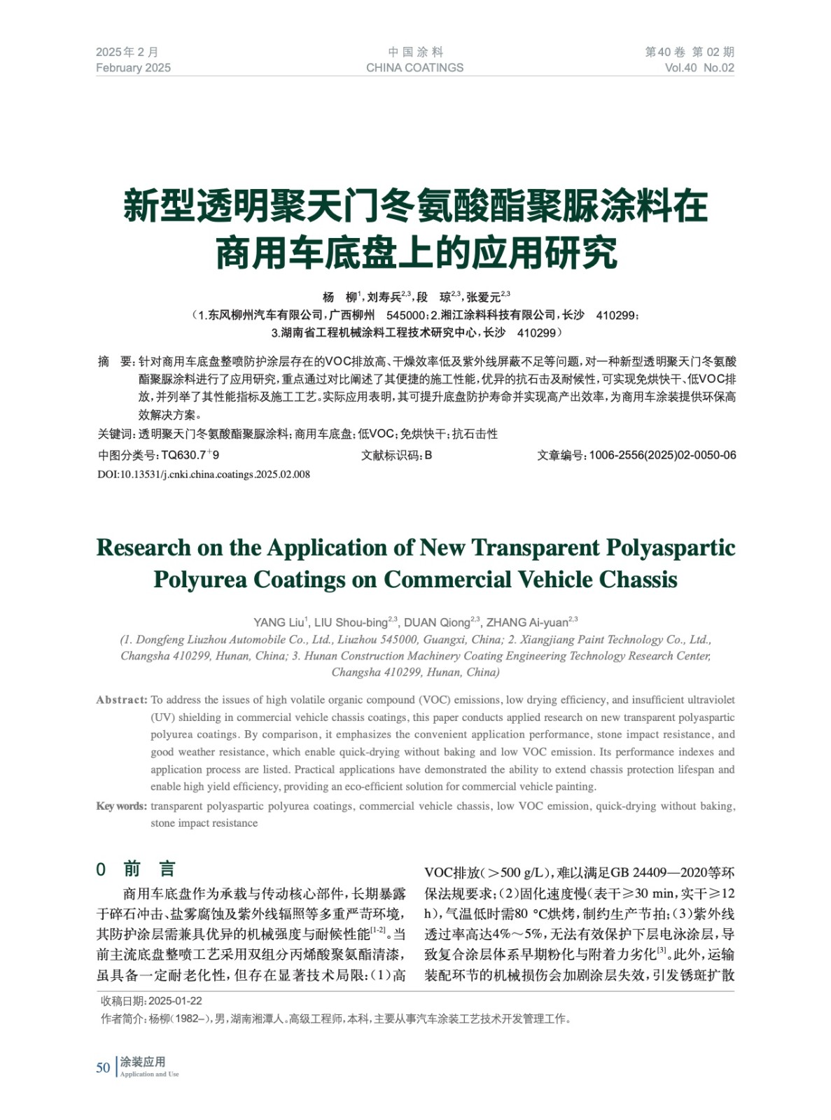 摘要:針對商用車底盤整噴防護(hù)涂層存在的VOC排放高、干燥效率低及紫外線屏蔽不足等問題,對一種新型透明聚天門冬氨酸酯聚脲涂料進(jìn)行了應(yīng)用研究,重點(diǎn)通過對比闡述了其便捷的施工性能,優(yōu)異的抗石擊及耐候性,可實(shí)現(xiàn)免烘快干、低VOC排放,并列舉了其性能指標(biāo)及施工工藝。實(shí)際應(yīng)用表明,其可提升底盤防護(hù)壽命并實(shí)現(xiàn)高產(chǎn)出效率,為商用車涂裝提供環(huán)保高效解決方案。
