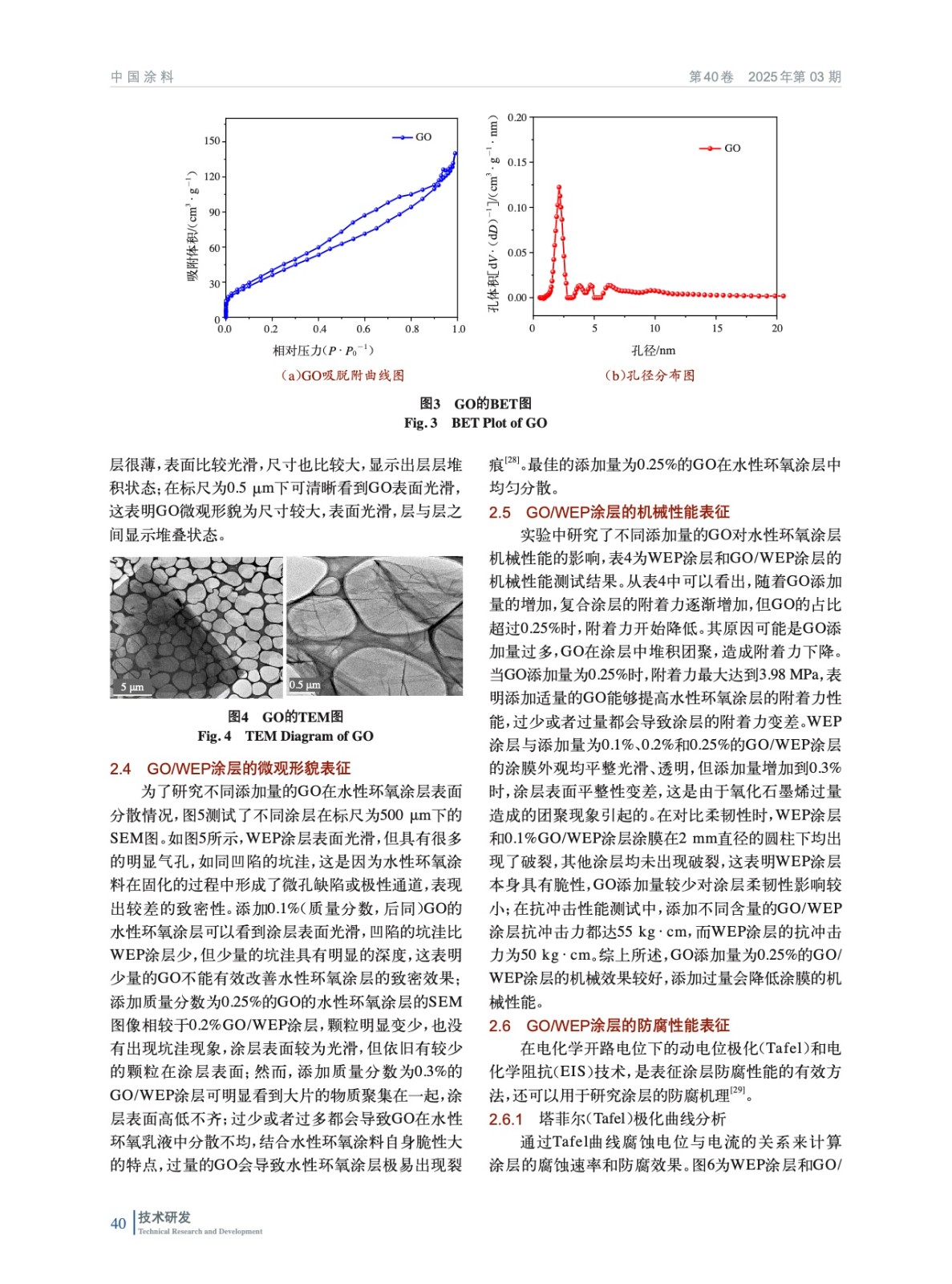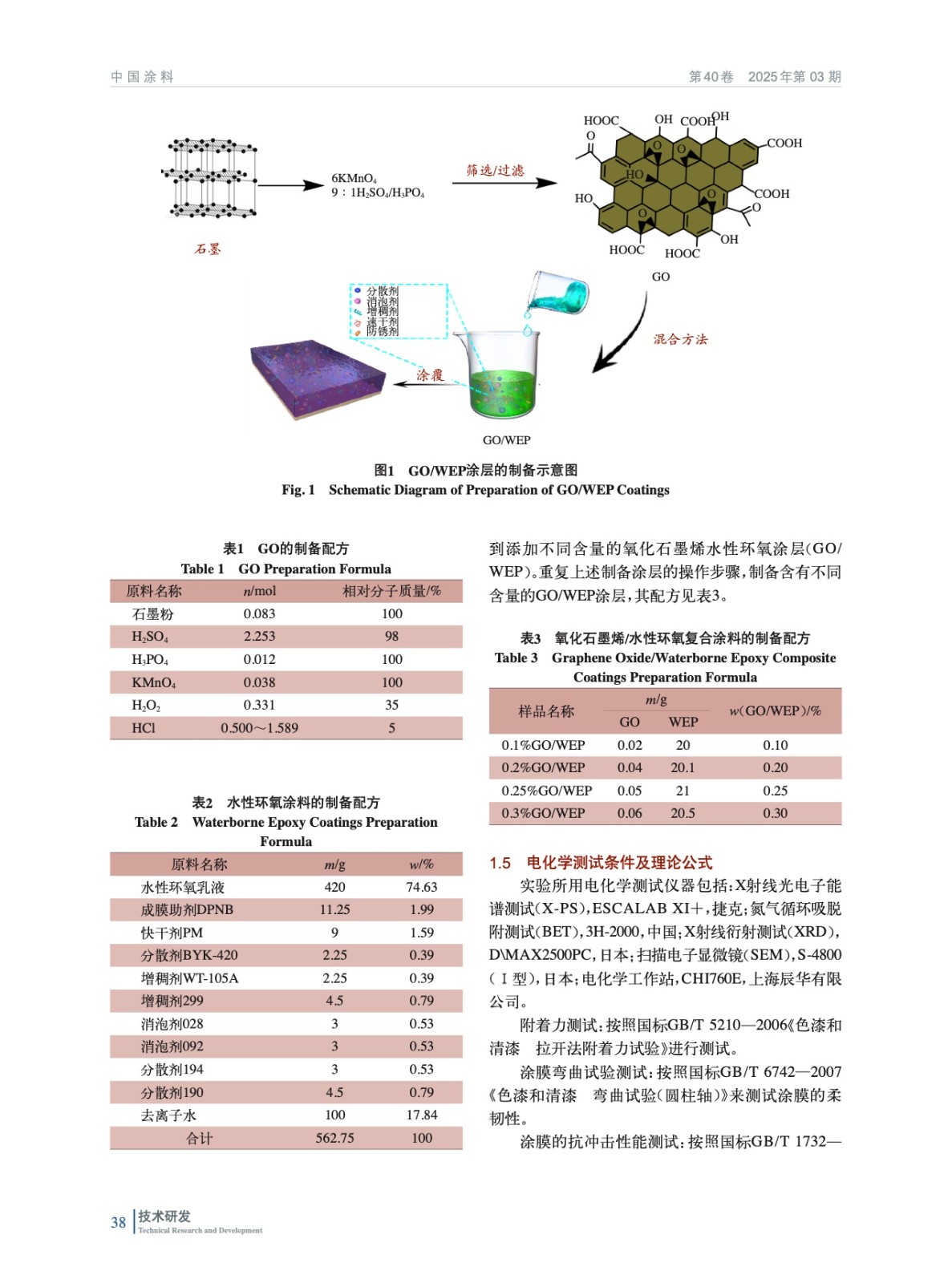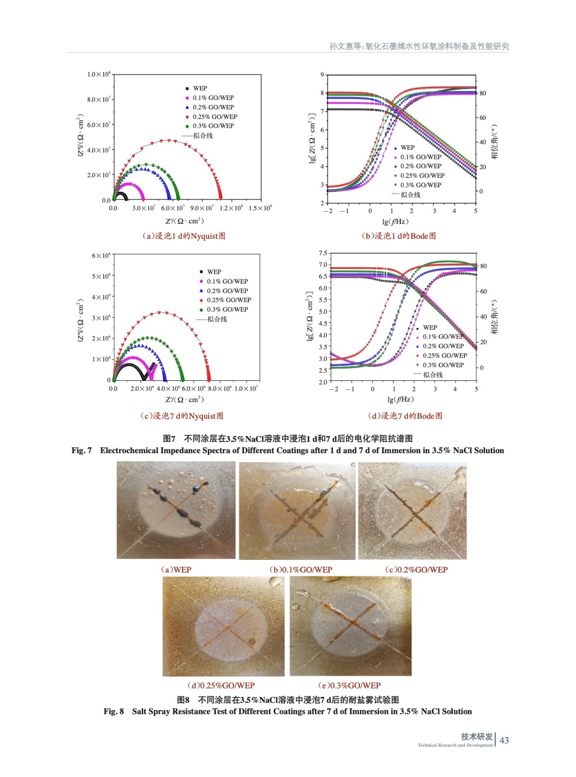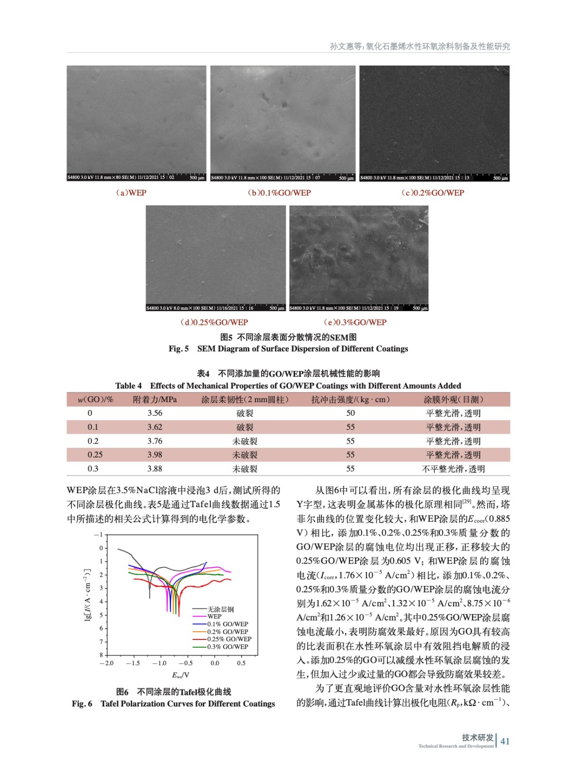 摘要:采用改進的Hummer’s方法制備氧化石墨烯(Graphene Oxide,GO)納米材料,通過X-PS和SEM測試結果表明:二維片層結構GO表面含有較多的含氧官能團。然后制備氧化石墨烯水性環氧涂料(GO-WEP),探究不同含量氧化石墨烯對水性環氧樹脂涂層性能影響。與空白WEP涂層進行性能對比,添加量為0.25%(質量分數,后同)GO水性環氧涂層表面形貌平整,GO在涂層表面分散均勻,提高WEP涂層致密性;附著力可達到3.98 MPa,抗沖擊性為55 kg·cm,改善了WEP涂層的機械性能;通過電化學極化曲線和EIS阻抗測試表明:0.25%GO-WEP涂層與空白WEP涂層相比,防腐效率從89.83%提高至94.95%,|Z|0.01 Hz值可達到1.09×108 Ω·cm2;0.25%GO-WEP涂層表現出良好的防腐性能。