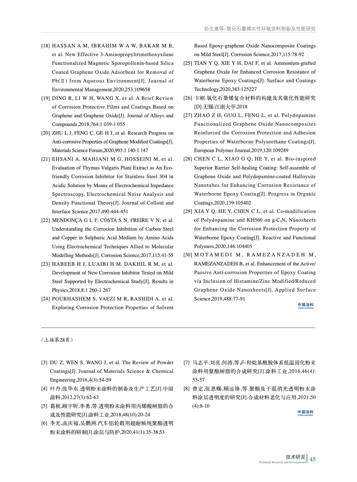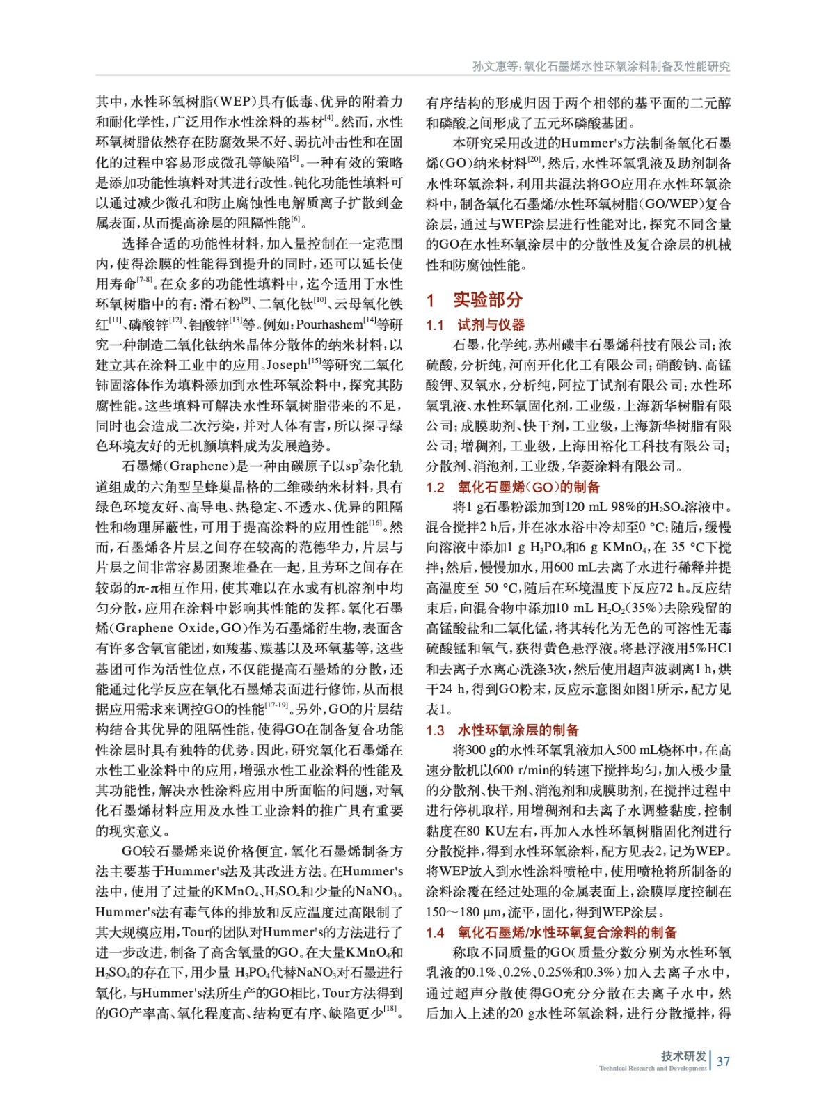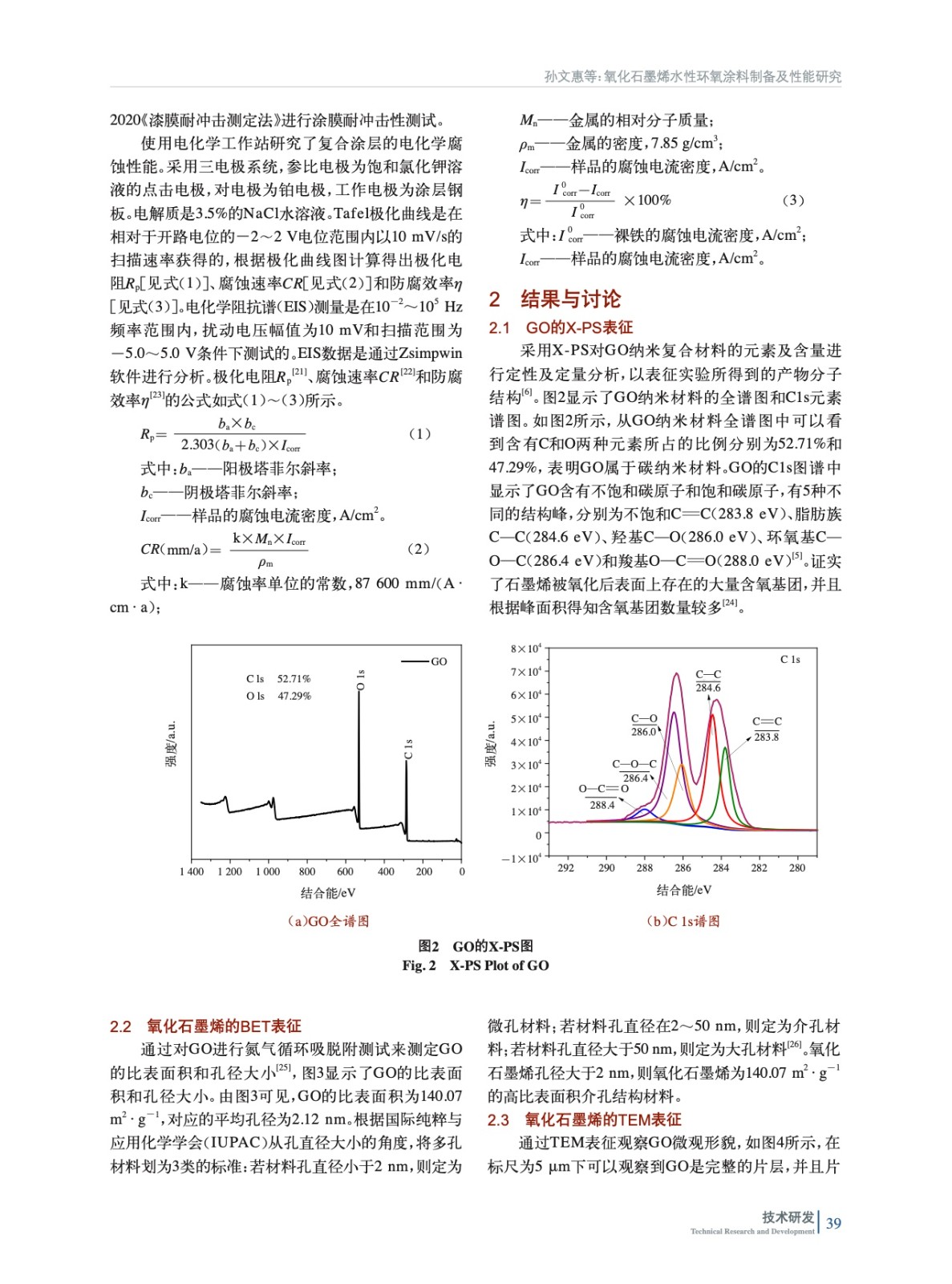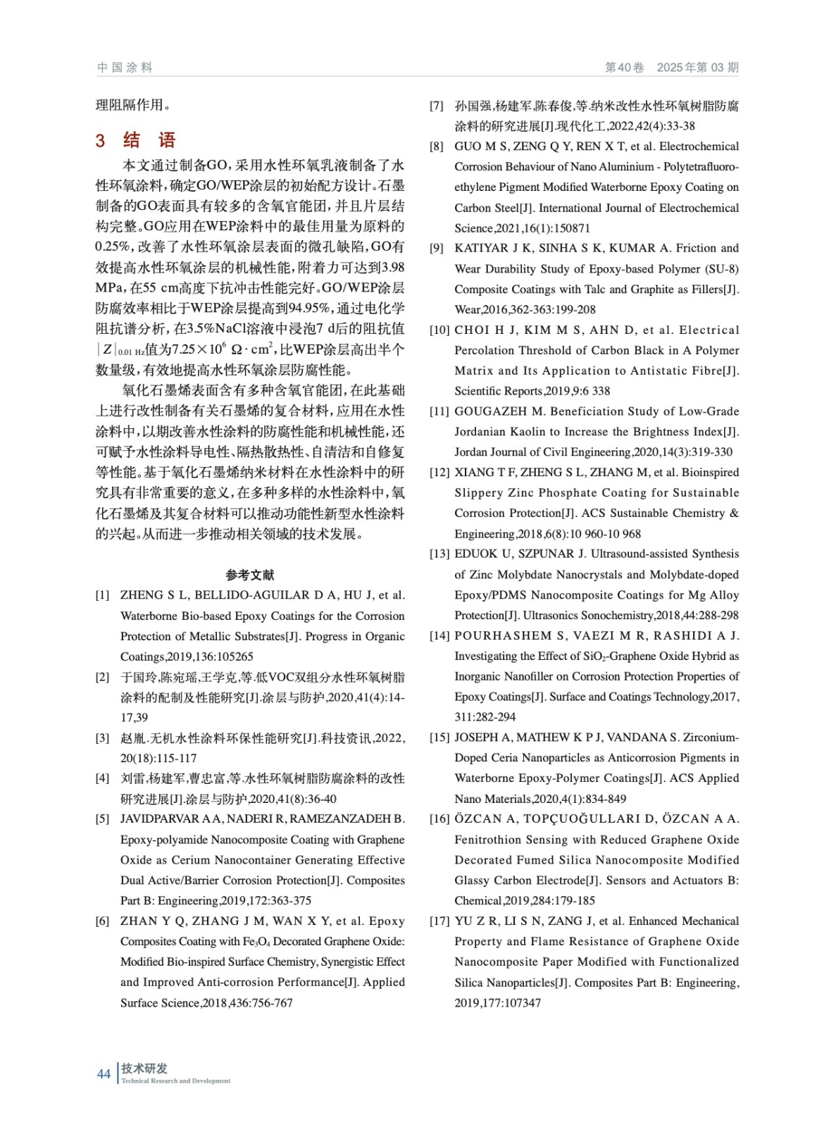 摘要:采用改進的Hummer’s方法制備氧化石墨烯(Graphene Oxide,GO)納米材料,通過X-PS和SEM測試結果表明:二維片層結構GO表面含有較多的含氧官能團。然后制備氧化石墨烯水性環氧涂料(GO-WEP),探究不同含量氧化石墨烯對水性環氧樹脂涂層性能影響。與空白WEP涂層進行性能對比,添加量為0.25%(質量分數,后同)GO水性環氧涂層表面形貌平整,GO在涂層表面分散均勻,提高WEP涂層致密性;附著力可達到3.98 MPa,抗沖擊性為55 kg·cm,改善了WEP涂層的機械性能;通過電化學極化曲線和EIS阻抗測試表明:0.25%GO-WEP涂層與空白WEP涂層相比,防腐效率從89.83%提高至94.95%,|Z|0.01 Hz值可達到1.09×108 Ω·cm2;0.25%GO-WEP涂層表現出良好的防腐性能。