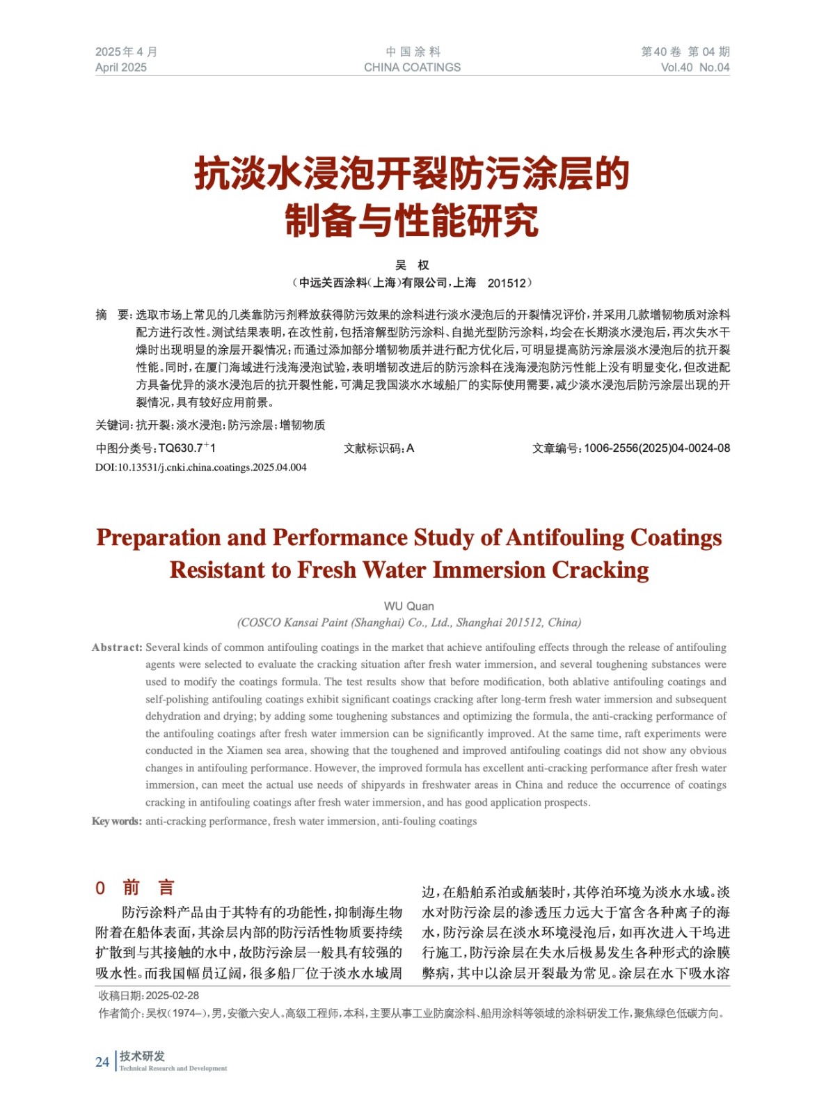 摘要:選取市場(chǎng)上常見(jiàn)的幾類(lèi)靠防污劑釋放獲得防污效果的涂料進(jìn)行淡水浸泡后的開(kāi)裂情況評(píng)價(jià),并采用幾款增韌物質(zhì)對(duì)涂料配方進(jìn)行改性。測(cè)試結(jié)果表明,在改性前,包括溶解型防污涂料、自拋光型防污涂料,均會(huì)在長(zhǎng)期淡水浸泡后,再次失水干燥時(shí)出現(xiàn)明顯的涂層開(kāi)裂情況;而通過(guò)添加部分增韌物質(zhì)并進(jìn)行配方優(yōu)化后,可明顯提高防污涂層淡水浸泡后的抗開(kāi)裂性能。同時(shí),在廈門(mén)海域進(jìn)行淺海浸泡試驗(yàn),表明增韌改進(jìn)后的防污涂料在淺海浸泡防污性能上沒(méi)有明顯變化,但改進(jìn)配方具備優(yōu)異的淡水浸泡后的抗開(kāi)裂性能,可滿(mǎn)足我國(guó)淡水水域船廠的實(shí)際使用需要,減少淡水浸泡后防污涂層出現(xiàn)的開(kāi)裂情況,具有較好應(yīng)用前景。