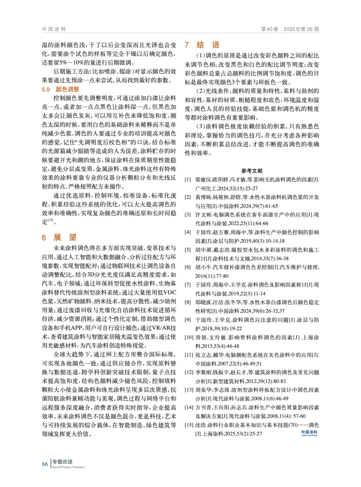 摘要:旨在深入探討涂料調色的原理與方法,全面總結了色彩理論,列舉出幾種常用的顏色空間模型,詳細說明了各個顏色模型的應用方法、特點及應用領域。并闡述了涂料調色遵循減法原理,多種不同彩色的顏料混合后,明度下降。調色的原理是通過改變彩色顏料之間的配比來調節色相;改變黑色和白色的配比調節明度;改變彩色顏料占總顏料的比例調節飽和度。調色的目標是最終實現顏色3個要素與樣板色一致。另外還闡述了涂料調色方法、技巧及影響因素,為涂料調色工作提供一定而實用的理論指導。