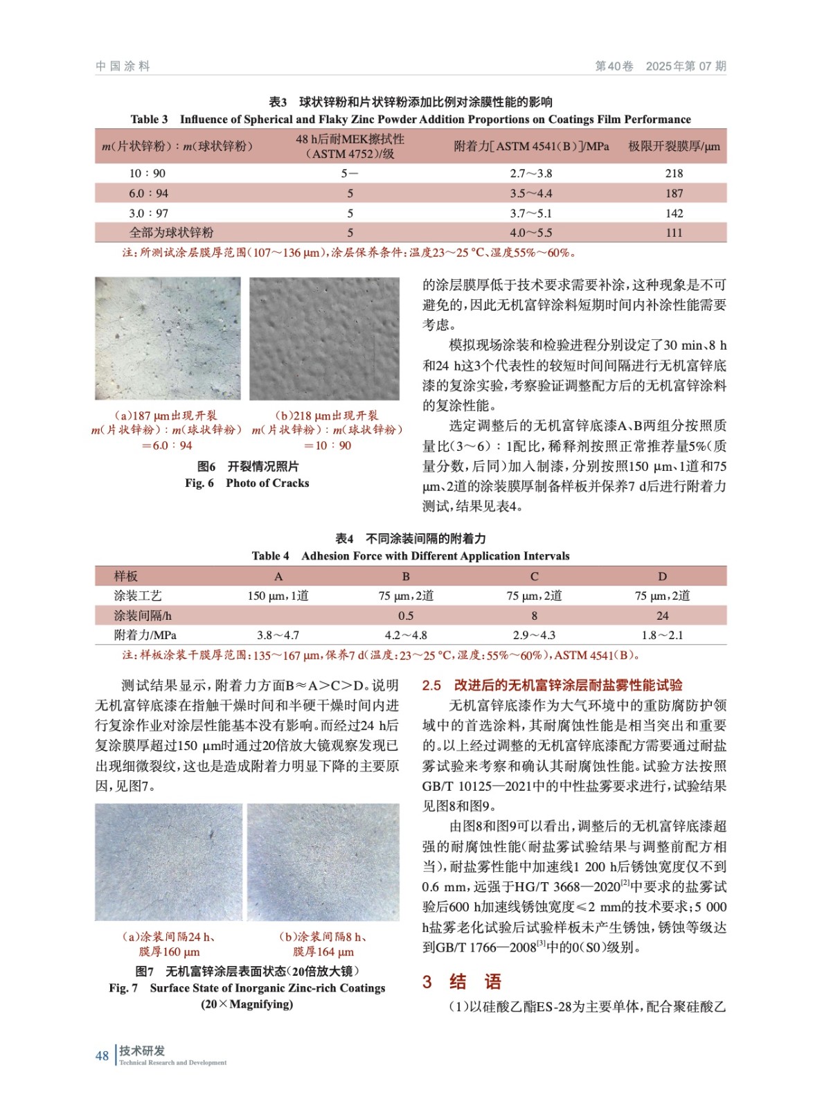 主要研究無機富鋅涂料的性能提升,探索制備具有耐腐蝕性強、厚涂不開裂和貯存穩定性好并在一定條件下可復涂同種涂料的高性能無機富鋅底漆。采用多種實驗測試方法對研制的無機富鋅涂層性能進行分析檢測,最終得到滿足各大項目現場實際需求的、各項性能優異的無機富鋅產品。