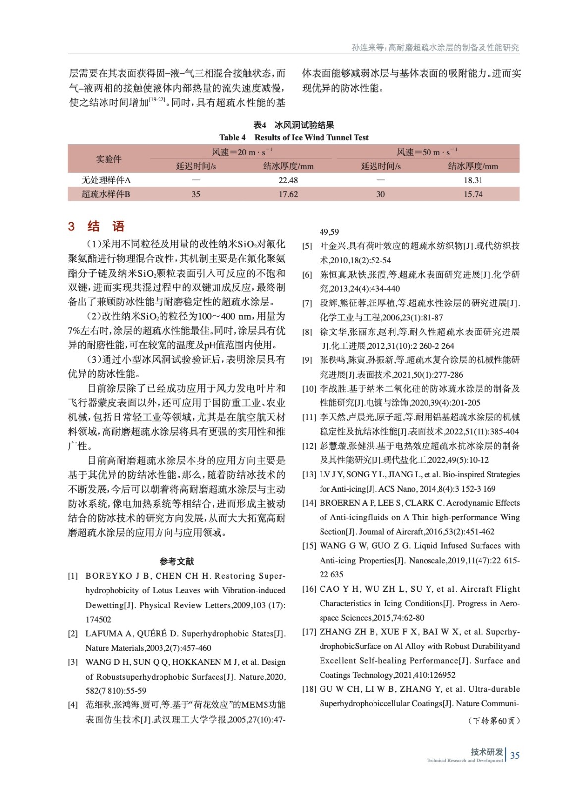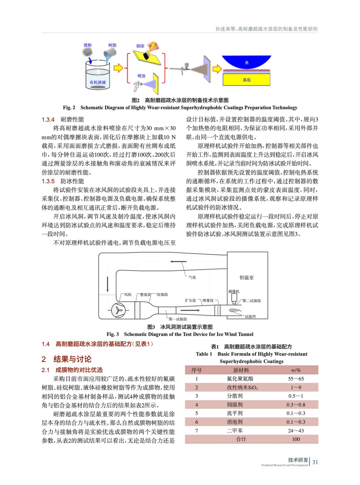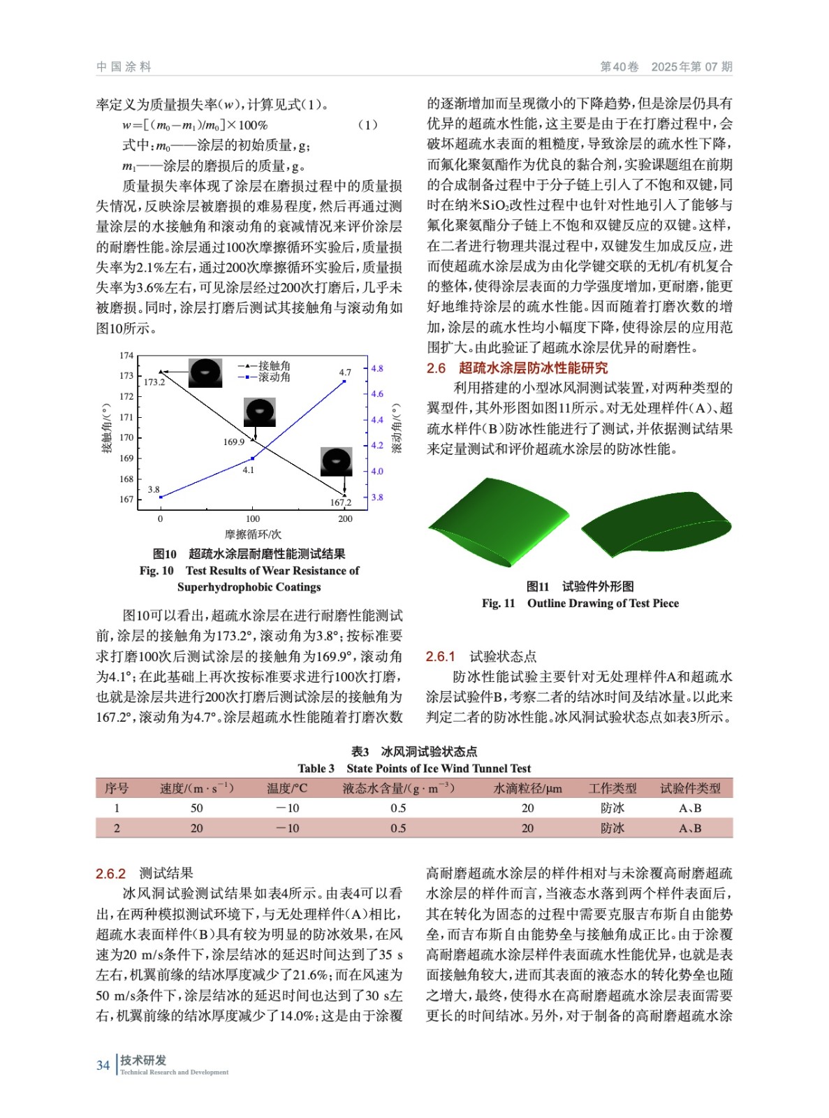 摘要:為了有效提高飛行器蒙皮表面涂層的防覆冰性能和耐磨性,以自制的高性能氟化聚氨酯和改性納米SiO2為原料,采用物理混合的方法成功制備出高耐磨超疏水涂層材料。探討了改性納米SiO2用量和粒徑大小對涂層疏水性能的影響。討論了不同溫度和不同pH值對涂層穩(wěn)定性的影響。最后,對涂層的耐磨性及防冰性能進(jìn)行了研究,改性納米SiO2的粒徑為100~400 nm,質(zhì)量分?jǐn)?shù)為7%左右時,涂層的疏水性能最佳。同時,涂層具有優(yōu)異的耐磨和防冰性能,可在較寬的溫度及pH值范圍內(nèi)使用,通過小型冰風(fēng)洞試驗后,在風(fēng)速為20 m/s條件下,涂覆高耐磨超疏水的涂層樣件相對于未涂覆高耐磨超疏水的涂層樣件的結(jié)冰時間延遲了35 s左右,機(jī)翼前緣的結(jié)冰厚度減少了21.6%;而在風(fēng)速為50 m/s條件下,涂覆高耐磨超疏水涂層樣件相對于未涂覆高耐磨超疏水涂層樣件的結(jié)冰時間延遲了30 s左右,機(jī)翼前緣的結(jié)冰厚度減少了14.0%。合理控制超疏水涂層中改性納米SiO的用量和粒徑大小能夠顯著提高涂層防冰和耐磨性,涂層具有良好的應(yīng)用潛力。