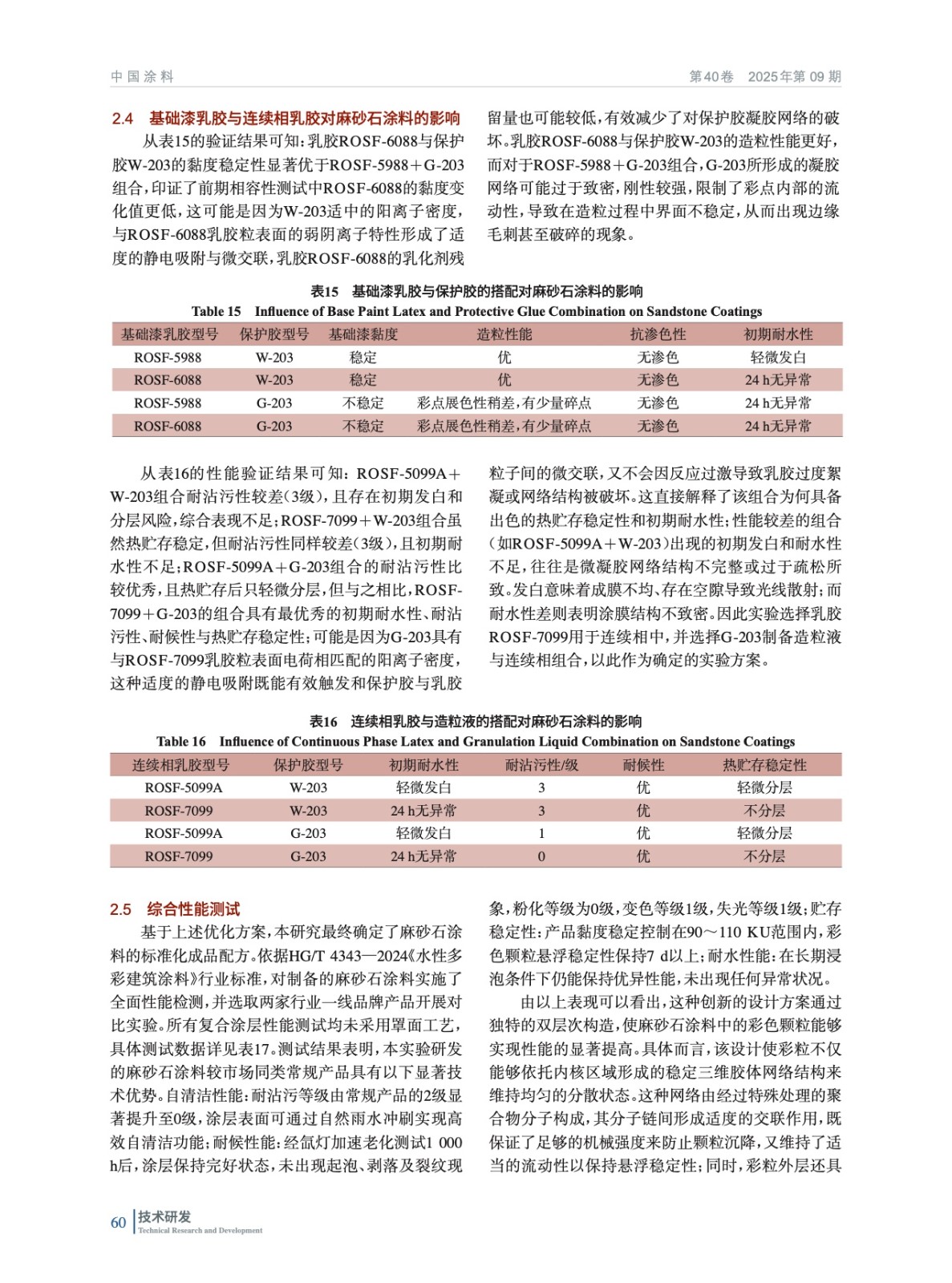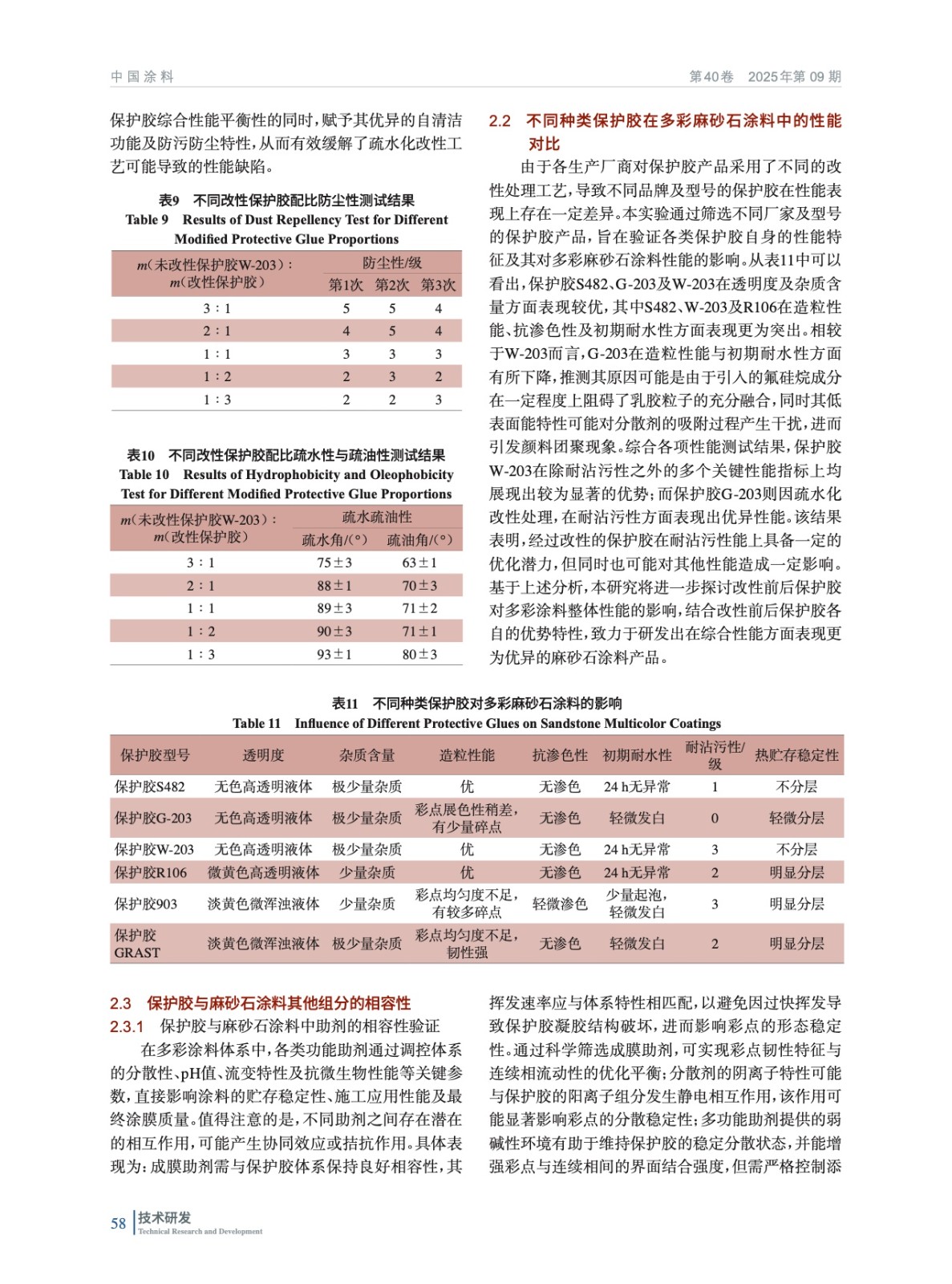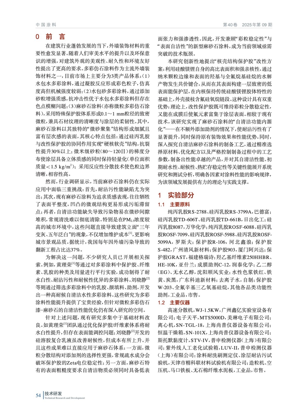 摘要:通過保護(hù)膠改性、原材料選擇與配方優(yōu)化,系統(tǒng)研究了其對(duì)多彩麻砂石涂料自清潔性能、初期耐水性、耐候性、熱貯存穩(wěn)定性等性能的影響,制備了兼具自清潔功能與優(yōu)異裝飾性能的多彩麻砂石涂料。結(jié)果表明,通過對(duì)保護(hù)膠的改性處理,可在改性后的保護(hù)膠中引入疏水基團(tuán),有效降低表面能,形成優(yōu)異的疏水效果,但會(huì)對(duì)其原有的抗靜電及防塵功能產(chǎn)生一定影響;將未改性保護(hù)膠與氟化改性保護(hù)膠按質(zhì)量比2∶1均勻混合后,能夠產(chǎn)生協(xié)同作用,在維持保護(hù)膠原有的抗靜電與防塵效果的同時(shí),顯著增強(qiáng)其疏水/疏油性能;在基礎(chǔ)漆中,純丙乳膠ROSF-6088與保護(hù)膠W-203的組合表現(xiàn)更為優(yōu)越,在連續(xù)相與造粒液中,硅丙乳膠ROSF-7099與多功能保護(hù)膠G-203的組合在初期耐水性、耐沾污性、耐候性以及熱貯存穩(wěn)定性方面均展現(xiàn)出最優(yōu)性能。基于以上保護(hù)膠與乳膠組合所開發(fā)的高性能麻砂石涂料,其在自清潔能力、耐沾污性及耐候性等方面表現(xiàn)突出,同時(shí)兼具良好的施工適應(yīng)性與經(jīng)濟(jì)適用性,該研究成果為高性能自清潔外墻涂料的開發(fā)提供了創(chuàng)新性技術(shù)路徑。