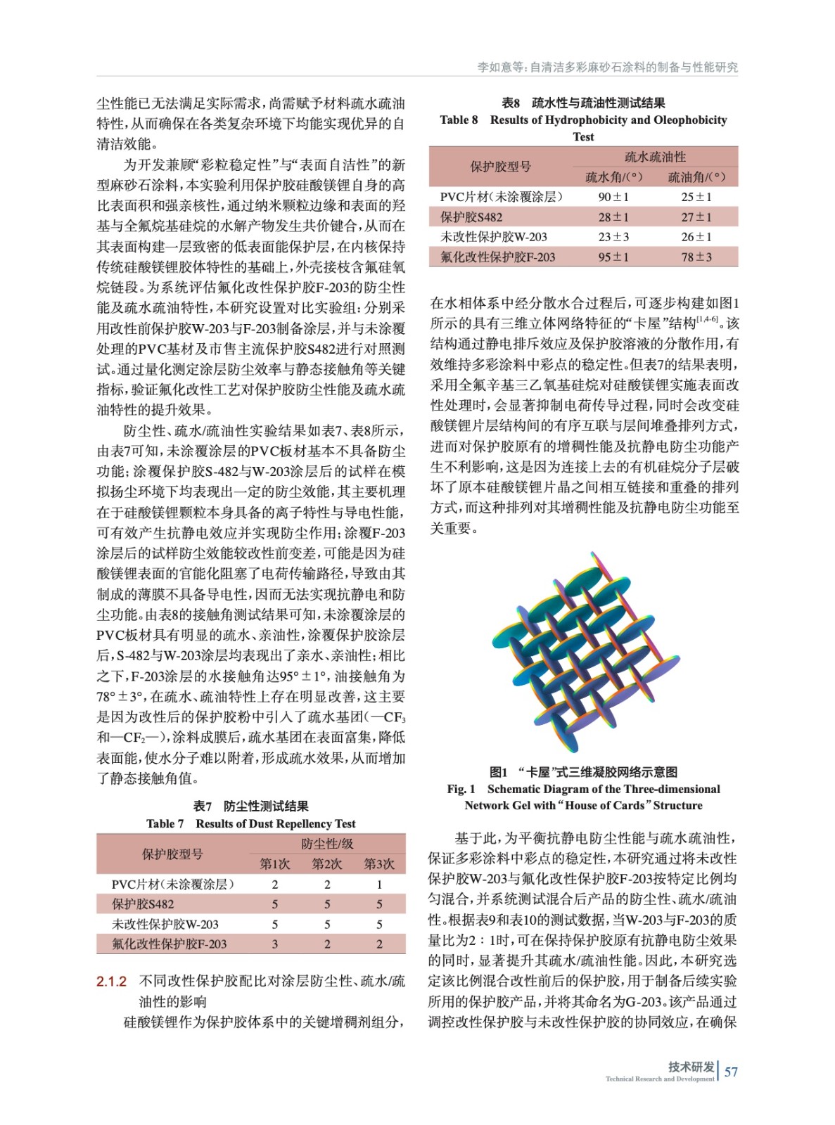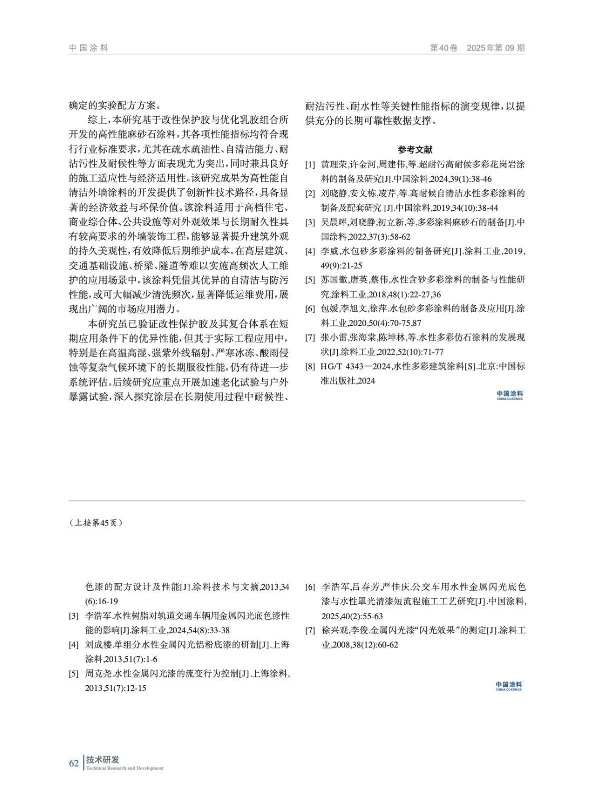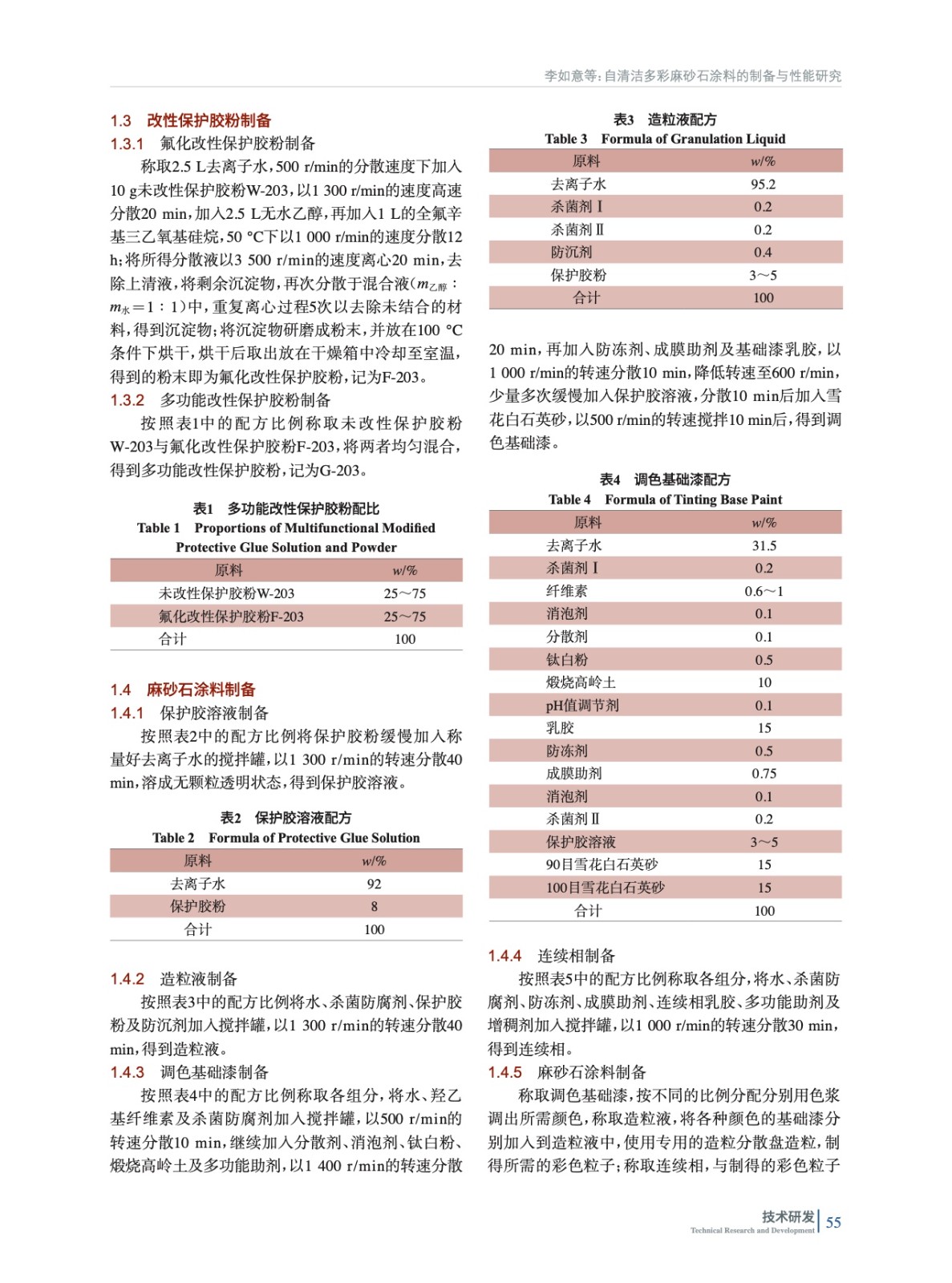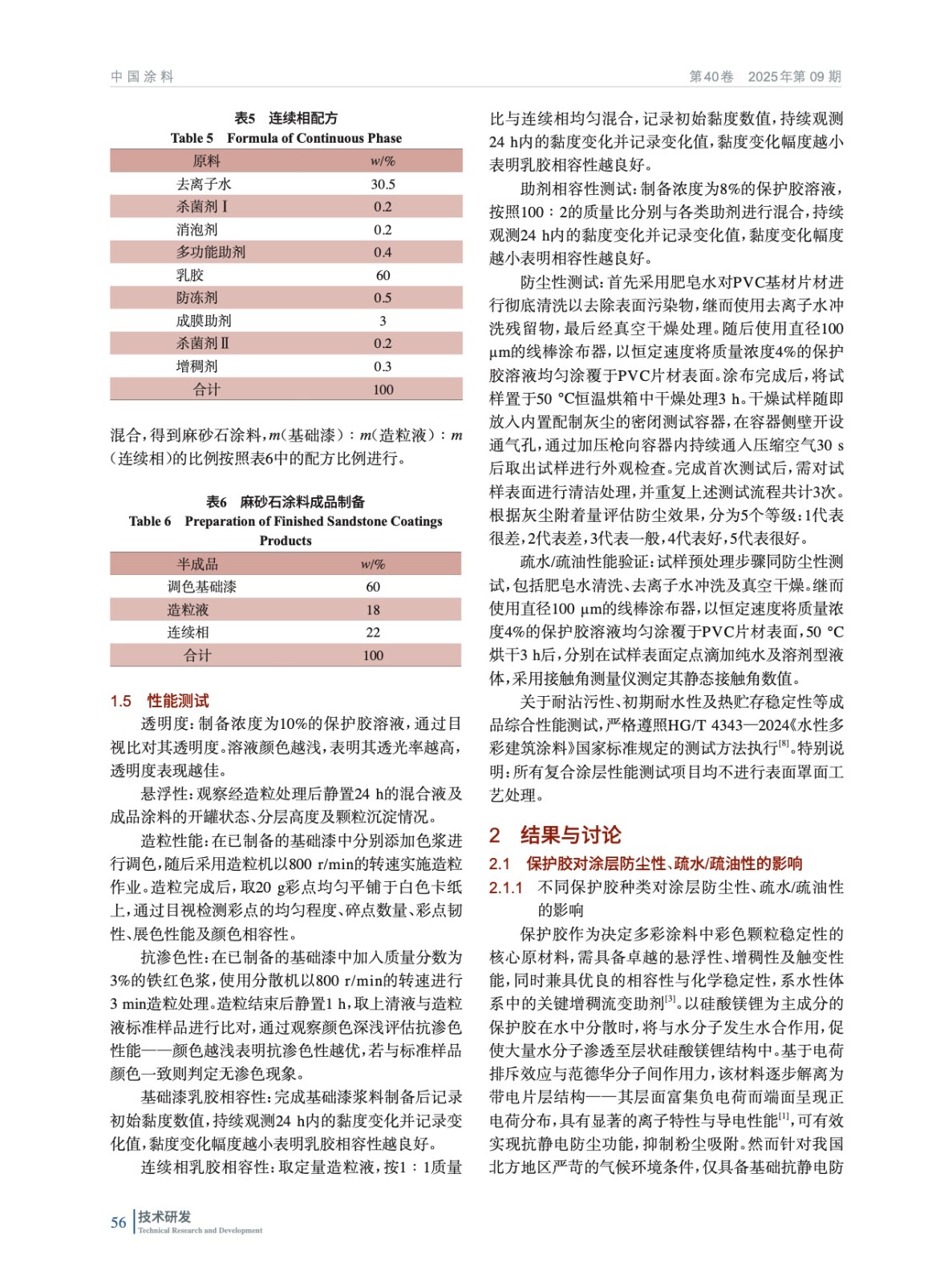 摘要:通過保護(hù)膠改性、原材料選擇與配方優(yōu)化,系統(tǒng)研究了其對(duì)多彩麻砂石涂料自清潔性能、初期耐水性、耐候性、熱貯存穩(wěn)定性等性能的影響,制備了兼具自清潔功能與優(yōu)異裝飾性能的多彩麻砂石涂料。結(jié)果表明,通過對(duì)保護(hù)膠的改性處理,可在改性后的保護(hù)膠中引入疏水基團(tuán),有效降低表面能,形成優(yōu)異的疏水效果,但會(huì)對(duì)其原有的抗靜電及防塵功能產(chǎn)生一定影響;將未改性保護(hù)膠與氟化改性保護(hù)膠按質(zhì)量比2∶1均勻混合后,能夠產(chǎn)生協(xié)同作用,在維持保護(hù)膠原有的抗靜電與防塵效果的同時(shí),顯著增強(qiáng)其疏水/疏油性能;在基礎(chǔ)漆中,純丙乳膠ROSF-6088與保護(hù)膠W-203的組合表現(xiàn)更為優(yōu)越,在連續(xù)相與造粒液中,硅丙乳膠ROSF-7099與多功能保護(hù)膠G-203的組合在初期耐水性、耐沾污性、耐候性以及熱貯存穩(wěn)定性方面均展現(xiàn)出最優(yōu)性能。基于以上保護(hù)膠與乳膠組合所開發(fā)的高性能麻砂石涂料,其在自清潔能力、耐沾污性及耐候性等方面表現(xiàn)突出,同時(shí)兼具良好的施工適應(yīng)性與經(jīng)濟(jì)適用性,該研究成果為高性能自清潔外墻涂料的開發(fā)提供了創(chuàng)新性技術(shù)路徑。