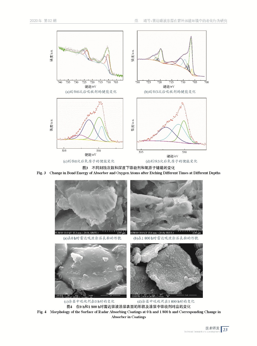 摘要:采用實驗室自制的雷達吸收涂層,探究雷達吸波涂層在紫外環(huán)境中的老化行為,開展了紫外光老化進行加速老化實驗。通過SEM和XPS分析表明,雷達吸波涂層吸收劑氧化產生了細小均勻的顆粒為Fe2O3,通過EIS分析表明,環(huán)氧樹脂老化過程中產生了羧基陰離子,經過了紫外光的加速老化實驗,雷達吸波涂層的表面粗糙度從0.84 μm上升到了1.17 μm。