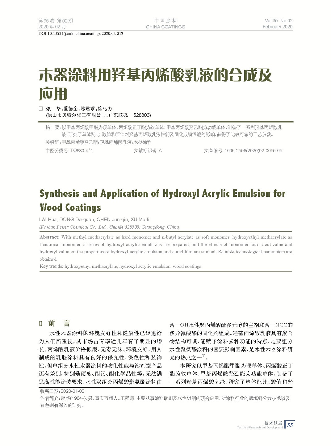 木器涂料用羥基丙烯酸乳液的合成及應(yīng)用