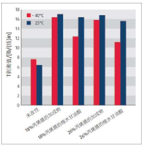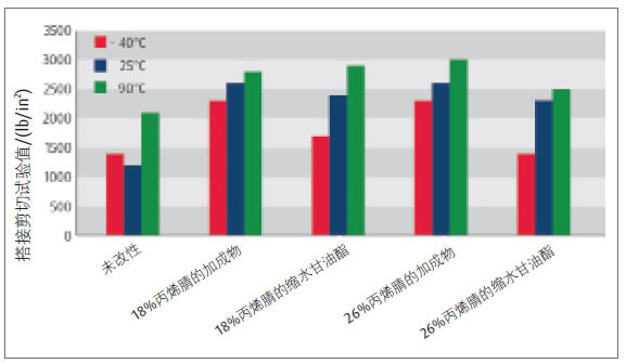 圖5和圖6表明,室溫(25 ℃)下T剝離結果和搭接剪切結果,均較低溫環境(-40 ℃)下的性能提高更大。膠黏劑在汽車和航空等工業領域使用時,要求在-40 ℃的氣溫下能保持良好的性能,這可以通過在環氧配方中加入較低玻璃化溫度的活性液態聚合物(TgRLP)來實現。