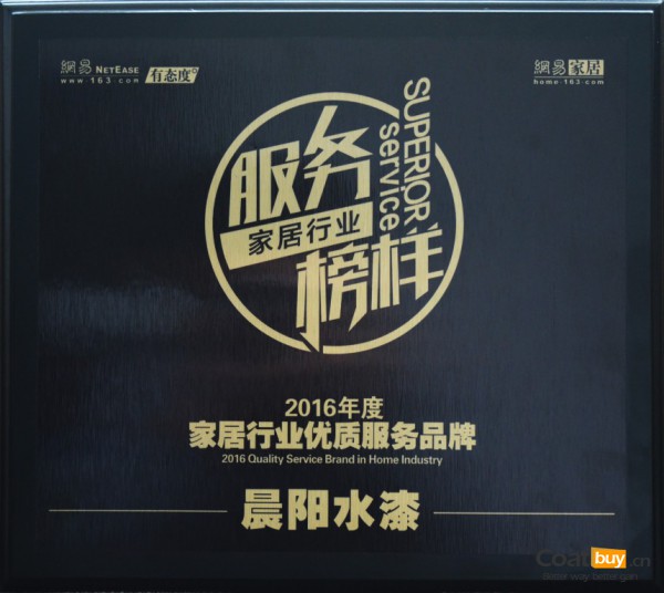 晨陽水漆的電話服務、電商服務、微信公眾號服務都以明顯絕對優勢優于競品,所以網易家居對在調查中表現優秀的晨陽水漆頒發了2016年度家居行業服務榜樣獎。晨陽水漆近兩年可謂蓬勃發展,勢頭猛烈,水漆的技術革新讓我們有了更環保、更健康的涂料。相信晨陽水漆會帶給消費者更新、更好的產品,讓我們拭目以待!
