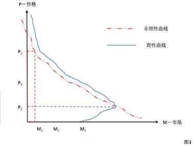 其次,根據(jù)圖2顯示:如果產(chǎn)品價格定在P3,那么銷售能夠達(dá)到的理想銷量是陰影的部分如果,輔以一定的市場營銷,銷量或許可以擴(kuò)展到虛線所示的面積。但是如果過渡營銷或者營銷不當(dāng)?shù)脑挘Y(jié)果會適得其反(如圖3所示)。這種案例比比皆是,大家可以對號入座。