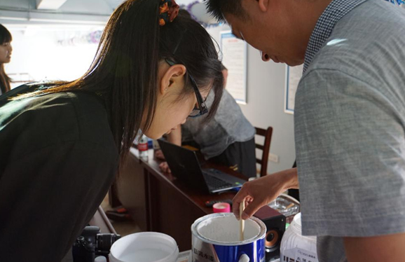 拿起板刷,在樣板上來(lái)回涂抹;風(fēng)干后,學(xué)生們觸摸漆面的質(zhì)地,觀察成品的效果,在實(shí)地研究學(xué)習(xí)水漆涂裝效果。近日,根據(jù)高等教育有關(guān)校企合作走“產(chǎn)、學(xué)、研”相結(jié)合道路的發(fā)展要求,武漢華中科技大學(xué)建筑系14級(jí)學(xué)生前往晨陽(yáng)水漆武漢旗艦店實(shí)地觀摩學(xué)習(xí)水漆的調(diào)配與涂刷過(guò)程。晨陽(yáng)水漆武漢地區(qū)銷(xiāo)售代表王金偉為同學(xué)們進(jìn)行了地坪漆及內(nèi)墻漆種類(lèi)、參數(shù)、施工方法等一系列的培訓(xùn)講解。