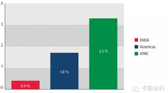 盡管2014-2015年全球涂料產量預計增長2.1%,但各地區(qū)市場增長情況明顯不同。預計EMEA(0.4%)和美洲地區(qū)(1.8%)的增速會低于全球平均水平,亞太地區(qū)(3.3%)的增速則高于全球平均水平。