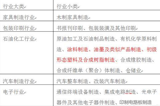 此次征收范圍涉及的5個(gè)行業(yè)大類(lèi)中排放揮發(fā)性有機(jī)物的17個(gè)行業(yè)小類(lèi),具體包括:家具制造行業(yè)的木制家具制造,包裝印刷行業(yè)的書(shū)報(bào)刊印刷、包裝裝潢及其他印刷,石油化工行業(yè)的原油加工及石油制品制造、有機(jī)化學(xué)原料制造、涂料制造、油墨及類(lèi)似產(chǎn)品制造、初級(jí)形態(tài)塑料及合成樹(shù)脂制造、合成橡膠制造、合成纖維單(聚合)體制造、倉(cāng)儲(chǔ)業(yè),汽車(chē)制造行業(yè)的汽車(chē)整車(chē)制造、改裝汽車(chē)制造,電子行業(yè)的通信終端設(shè)備制造、集成電路制造、光電子器件及其他電子器件制造、印制電路板制造。