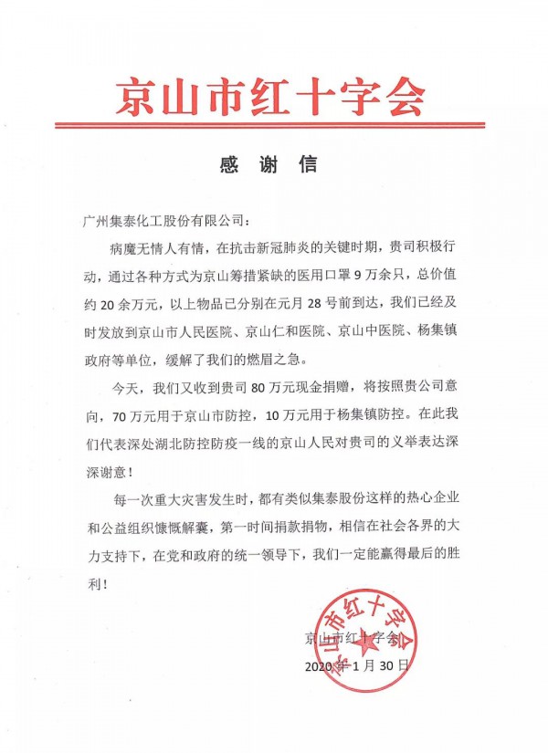 京山紅十字會(huì)在感謝信中表示,在抗擊新型肺炎的關(guān)鍵時(shí)期,集泰股份積極行動(dòng),通過(guò)各種方式為京山籌措緊缺的醫(yī)用口罩,緩解了前線的燃眉之急。80萬(wàn)的現(xiàn)金捐贈(zèng)他們將用于京山市及楊集鎮(zhèn)防控防疫,他們代表身處湖北防控防疫一線的京山人民對(duì)集泰股份的義舉深表感謝!