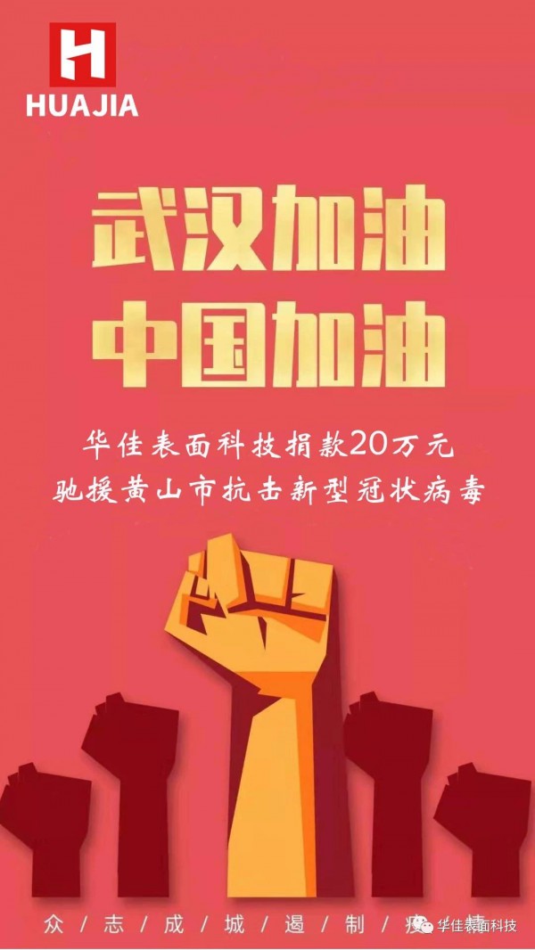 2020年2月6日,華佳表面科技通過黃山市紅十字會捐贈20萬元,將專項用于抗擊新型冠狀病毒感染肺炎疫情防控工作,助力打贏疫情防控阻擊戰。