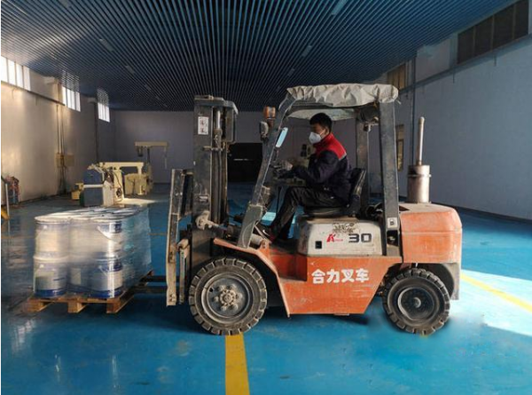 此時,員工何海山開著叉車過來了,正準備將剩下的一包防火涂料裝上車?!懊堪苛?2桶,都是工人們加班加點生產出來的?!焙魏I叫睦镉袛?,他已往車上裝了14包。