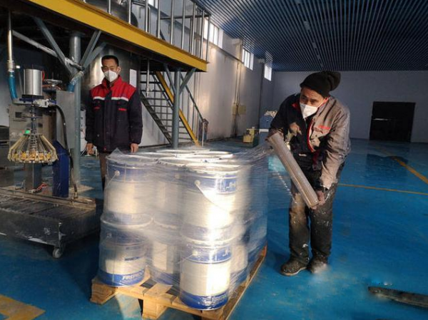 軍輝科技集團有限公司員工正在對防火涂料打包