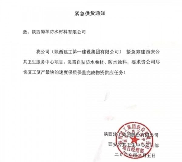 疫情面前,北新防水人一直奮戰(zhàn)在各地專業(yè)防疫醫(yī)院建設(shè)和發(fā)熱病房建設(shè)第一線。繼武漢火神山、鄭州小湯山等重大項(xiàng)目援建之后,2月6日,滿載北新蜀羊防水材料的貨車駛?cè)胛靼舶妗靶健贬t(yī)院工地。西安公共衛(wèi)生中心項(xiàng)目占地500畝,對(duì)標(biāo)4A標(biāo)準(zhǔn)建設(shè),1月31日晚上通知建設(shè)單位進(jìn)場(chǎng),北新建材將為西安版“小湯山”醫(yī)院提供北新防水材料和龍牌石膏板輕鋼龍骨墻體吊頂系統(tǒng)、涂料、粉料砂漿等全套優(yōu)質(zhì)環(huán)保新材料捐贈(zèng)援建,全力支持打贏這場(chǎng)防疫攻堅(jiān)戰(zhàn)。