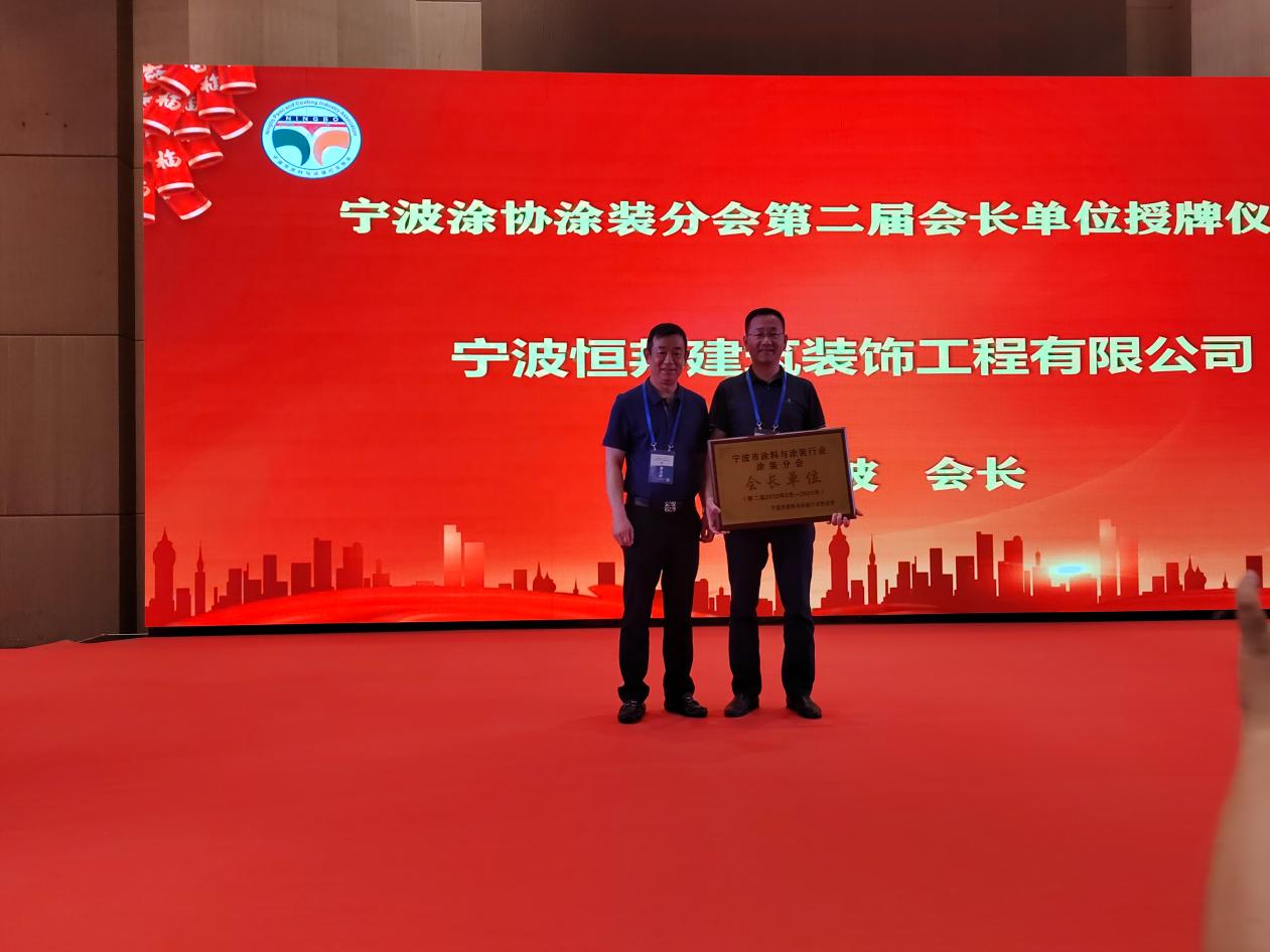 汪立波會長為當選寧波市涂料與涂裝行業協會涂裝分會第二屆會長單位及會長——寧波恒邦建筑裝飾工程有限公司李世良總經理授牌。