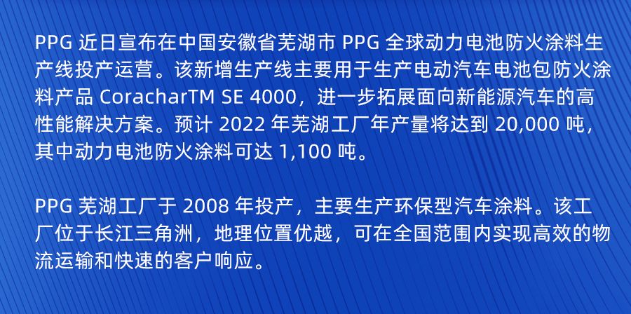 PPG近日宣布在中國安徽省蕪湖市PPG全球動力電池防火涂料生產(chǎn)線投產(chǎn)運營。