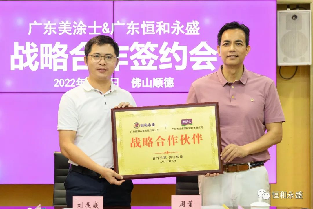聚力發展、互利共贏是時代的主旋律。在雙方團隊的見證下,恒和永盛集團董事長劉展威與美涂士董事長、總裁周偉建簽署了戰略合作協議。戰略合作協議的簽訂,有利于雙方構建合作發展的新平臺、新機制,進一步深化資源利用、產品研發創新、全流程服務等全方位合作與交流。戰略協同層次和水平的提升,將實現雙方創新能力最大化,在市場營銷、產品開發與創新、客戶服務等各個方面深化協作,向市場輸送更優質的產品服務,共同促進涂料行業的綠色低碳高質量發展。