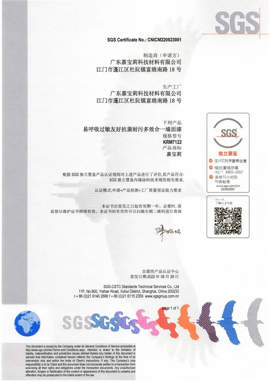 此次認證,是根據(jù)SGS獨立慧鑒產(chǎn)品認證規(guī)則,對嘉寶莉易呼吸墻面漆從VOC和甲醛等有害物質(zhì)的釋放量、防霉抗菌性能、氣味等不同維度進行專業(yè)嚴苛的實驗檢測和評價。
