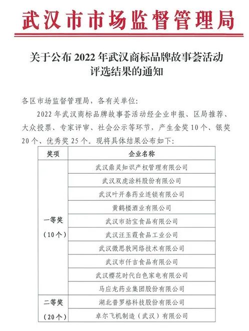 為大力推進知識產權強市建設,傳播武漢商標品牌好故事、好聲音,提升武漢商標品牌知名度和影響力,助推全市高質量發展,由市區市場監督管理局組織開展的“武漢商標品牌故事薈”活動于2022年4月開始舉行,全市各界經企業申報、區局推薦、大眾投票、專家評審、社會公示等環節,至2022年9月產生金獎10個、銀獎20個、優秀獎25個,武漢雙虎涂料股份有限公司榮獲金獎。