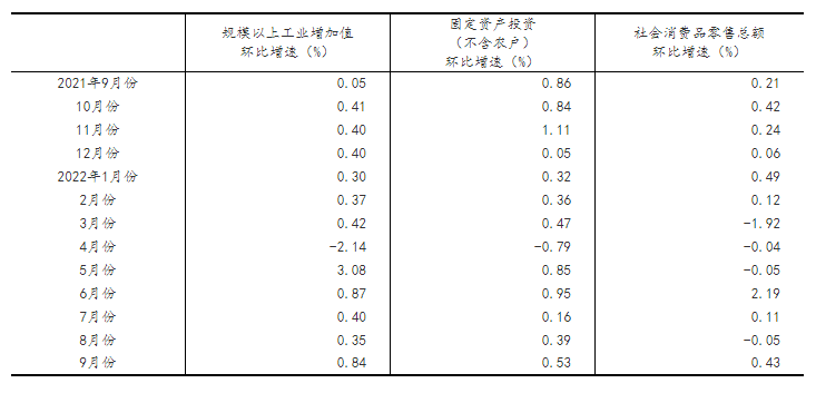 ?。?)根據季節調整模型自動修正結果,對近一年來各期國內生產總值、規模以上工業增加值、固定資產投資(不含農戶)、社會消費品零售總額環比增速進行修訂。修訂結果及2022年三季度GDP環比數據、2022年9月份其他指標環比數據如下:
