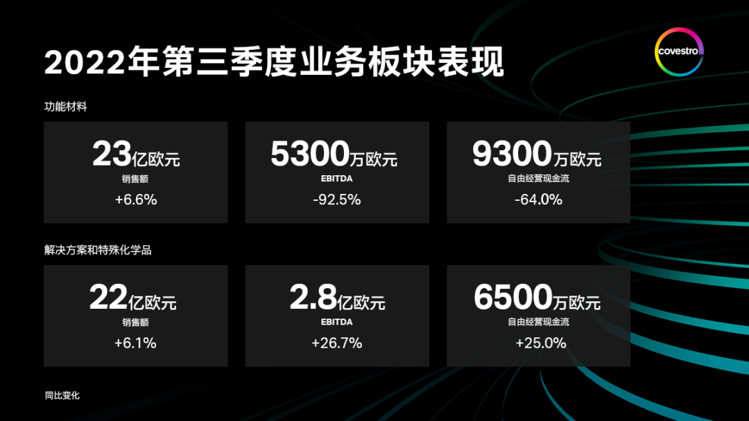 在匯率波動和銷售價格水平上漲的背景下,第三季度功能材料業務板塊銷售額同比增長6.6%至23億歐元。相反,因需求下滑導致的產品總銷量下降帶來了負面影響。該板塊EBITDA下降92.5%至5300萬歐元。這主要歸因于利潤率的下降,因為銷售價格水平提高只能在很小程度上抵消原材料和能源價格的上漲。特別受EBITDA下降影響,功能材料業務板塊自由經營現金流減少64%至9300萬歐元。