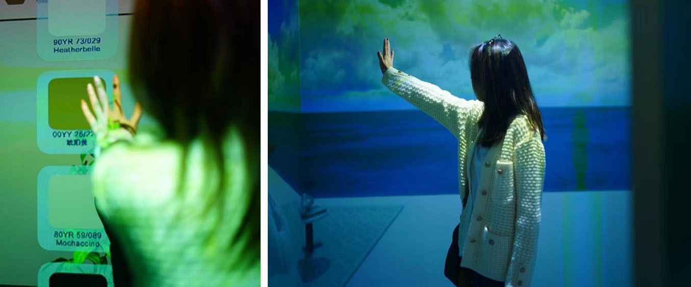 佩服多樂士把涂料展示做出了游戲感,讓人參與其中。在玩中體驗,在體驗中感受。人沉浸在其中,看到心儀的墻面效果,用手觸碰墻面,就會自動彈出對話框,告訴你這是多樂士森呼吸淳零系列的產品,并且展示這個產品的詳細介紹,擁有哪些認證、功能都羅列其中。總之就是“有吸引力,好看、有趣、酷炫”。