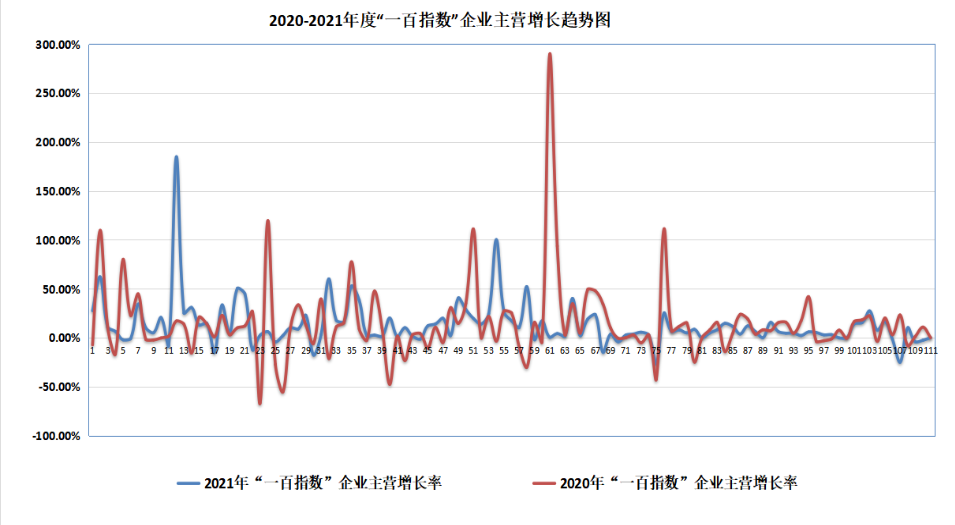 他還指出,從2020-2021年度“一百指數”企業主營增長趨勢來看,一百指數企業主營業務收入總和,相較于2020只有5.4%的增長來說,2021年取得了較為可喜的進步,同比前一年增長17.5%。