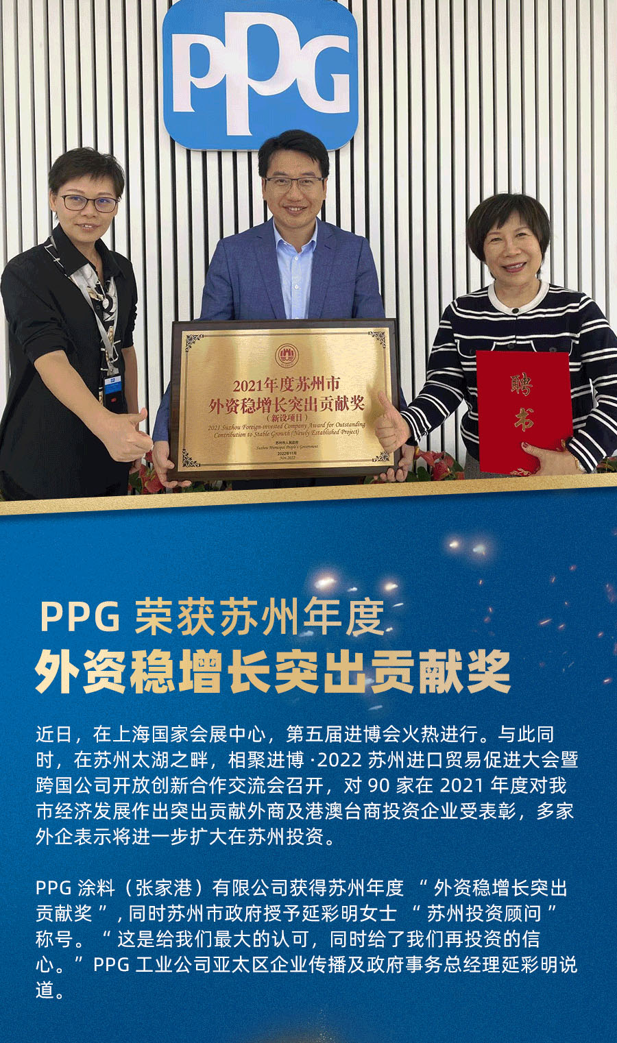喜訊|PPG榮獲蘇州年度“外資穩增長突出貢獻獎”