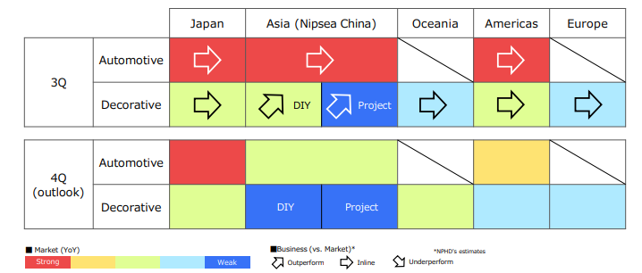 第三季度,全球汽車制造業市場表現出顯著的反彈,使得立邦汽車涂料業務在日本、中國、東南亞和美洲的地區保持了穩定的增長勢頭。第四季度受季節性原因,中國、東南亞的汽車市場可能會放緩節奏,但美洲和日本依舊市場看好。
