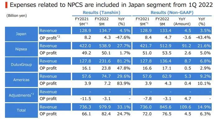 前三季度立邦在日本地區的營收同比增長4.5%至1347.15億日元(約合68億元人民幣)。受原材料價格上漲等因素影響,營業利潤同比下降47.6%至43.11億日元(約合2億元人民幣)。從第一季度開始,除與上市公司功能相關的業務和費用此前計入“調整”的純控股公司以外的所有業務均被剝離,移至日本部門,這一調整的目的,是為了更恰當地反映各應報告部門的經營業績。