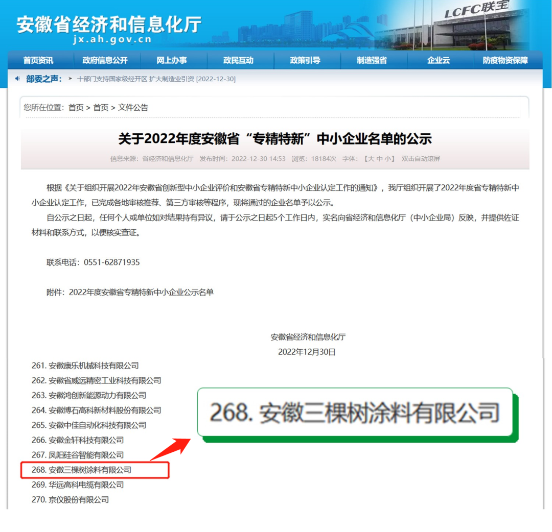 近日,安徽省經濟和信息化廳發布了《關于2022年度安徽省“專精特新”中小企業名單的公示》,安徽三棵樹涂料有限公司成功入選,順利通過了2022年安徽省“專精特新”企業認定。