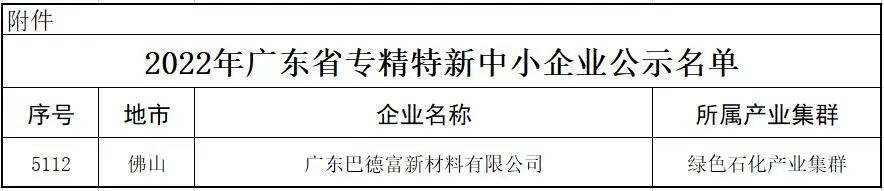 近日,廣東省工業(yè)和信息化廳對審核通過的2022年專精特新企業(yè)進(jìn)行了公示,巴德富集團(tuán)名列其中,榮獲2022年“廣東省專精特新企業(yè)”認(rèn)定。