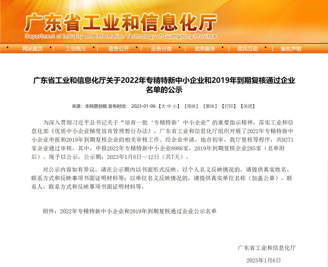 廣東省2022年“專精特新”企業(yè)名單公示