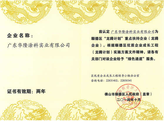 2014年10月,廣東省佛山市順德區人民政府發布《關于新一批龍騰企業的公示通告》,公布了通過復評和補增入選“龍騰企業”共300家企業名單。廣東華隆涂料實業有限公司,連續三次入選“龍騰企業”。